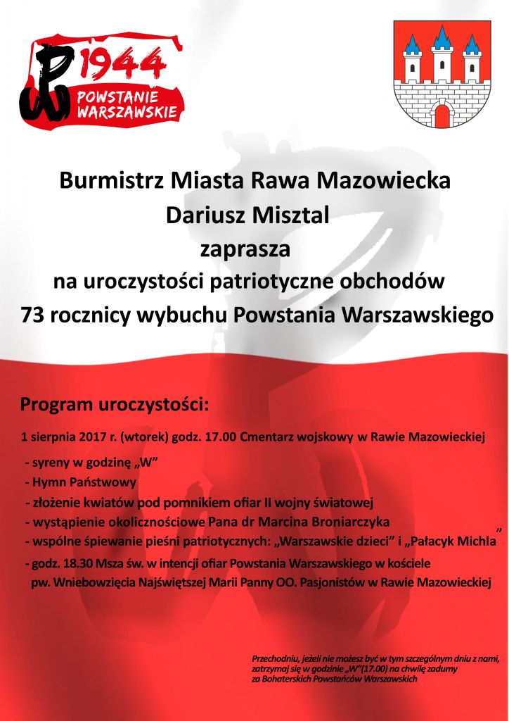 Burmistrz Rawy Mazowieckiej Dariusz Misztal serdecznie zaprasza na uroczystości obchodów 73 rocznicy wybuchu Powstania Warszawskiego.
