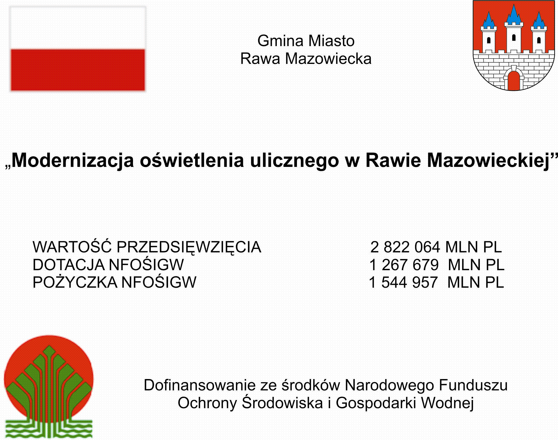 Umowa Nr 177/2014/Wn-05/OA-ES-ZI/D o dofinansowanie w formie dotacji oraz umowa Nr 1782014/Wn-05/OA-ES-KU/P o dofinansowanie w formie pożyczki w ramach Systemu Zielonych Inwestycji dla przedsięwizięcia " Modernizacja oświetlenia ulicznego w Rawie Mazowieckiej " została zawarta w dniu 09 kwietnia 2014r. pomiędzy Narodowym Funduszem Ochrony Środowiska i Gospodarki Wodnej w Warszawie oraz Gminą Miastem Rawa Mazowiecka.