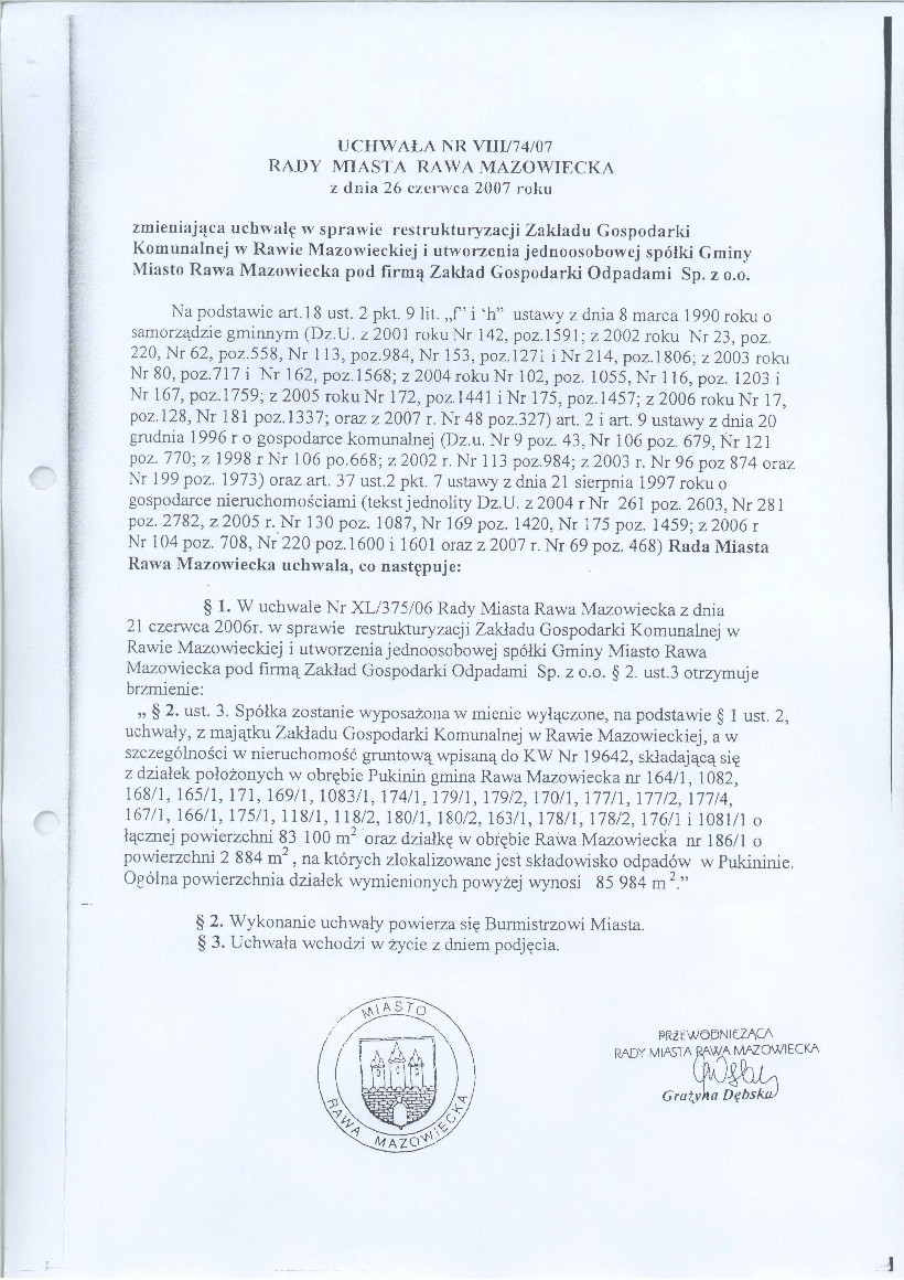Uchwała nr VIII/74/07 z dnia 26 czerwca 2007 r. zmieniająca uchwałę w sprawie restrukturyzacji Zakładu Gospodarki Komunalnej w Rawie Mazowieckiej i utworzenia jednoosobowej spółki Gminy Miasto Rawa Mazowiecka pod firmą Zakład Gospodarki Odpadami