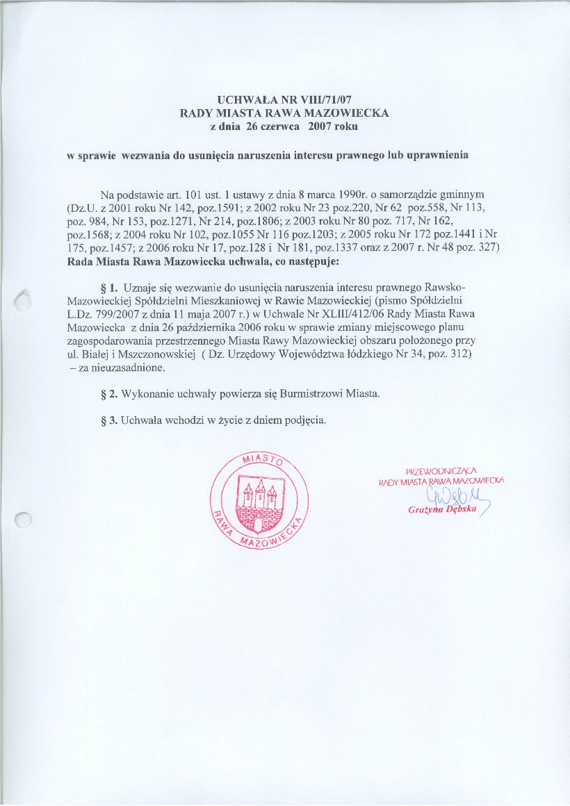 Uchwała nr VIII/71/07 z dnia 26 czerwca 2007 r. w sprawie wezwania do usunięcia naruszenia interesu prawnego lub uprawnienia