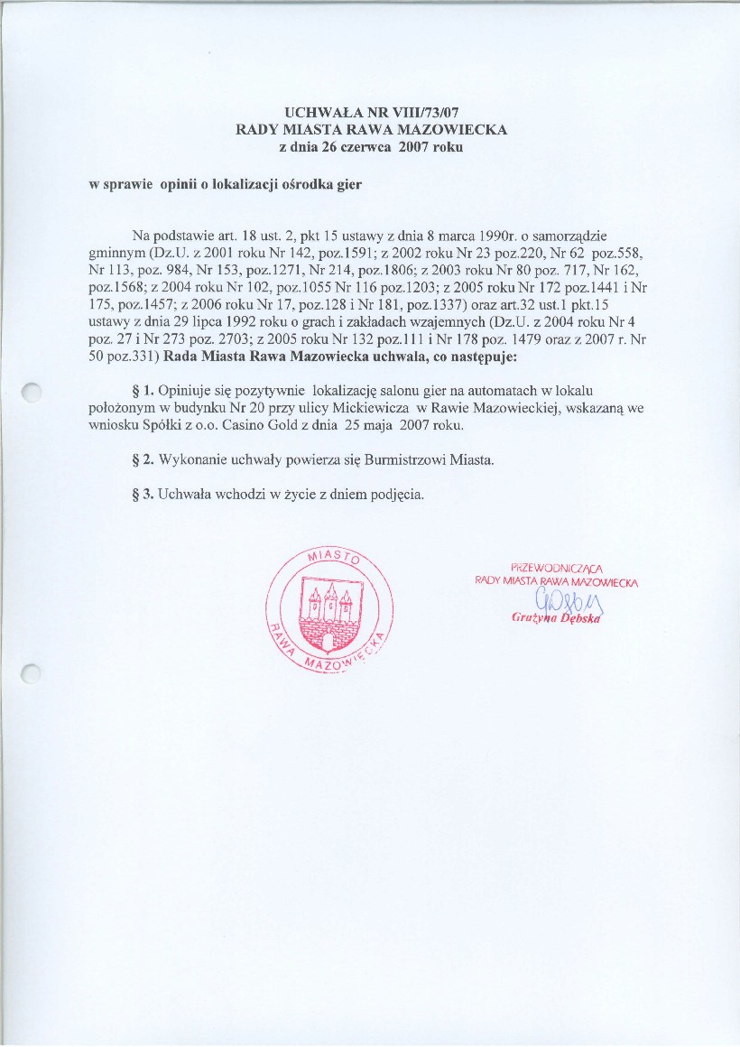 Uchwała nr VIII/73/07 z dnia 26 czerwca 2007 r. w sprawie opinii o lokalizacji