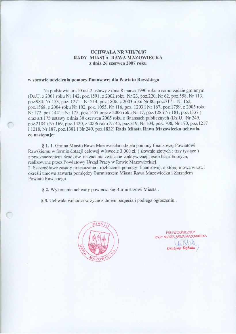 Uchwała nr VIII/76/07 z dnia 26 czerwca 2007 r. w sprawie udzielenia pomocy finansowej dla Powiatu Rawskiego