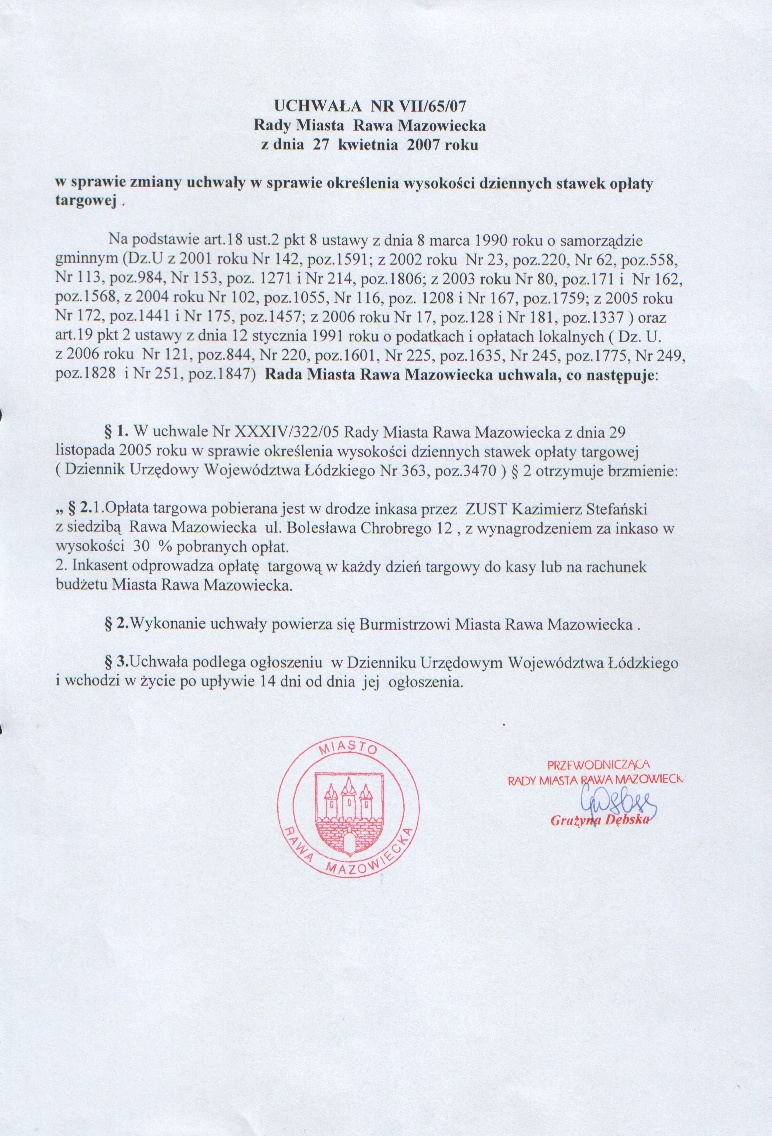 Uchwała nr VII/65/07 z dnia 27 kwietnia 2007 r. w sprawie zmiany uchwały w sprawie określenia wysokości dziennych stawek opłaty targowej.