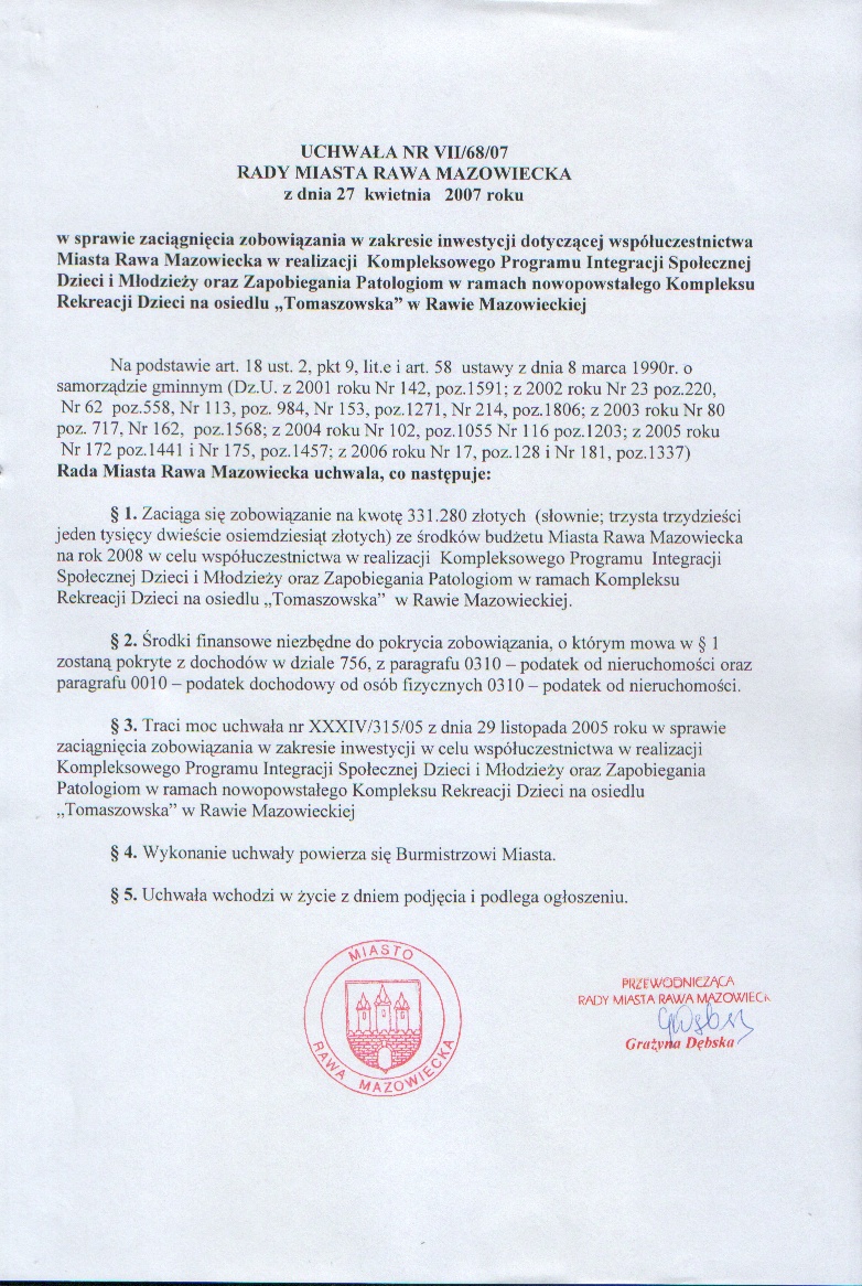Uchwała nr VII/68/07 z dnia 27 kwietnia 2007 r. w sprawie w sprawie zaciągnięcia zobowiązania w zakresie inwestycji dotyczącej współuczestnictwa Miasta Rawa Mazowieka