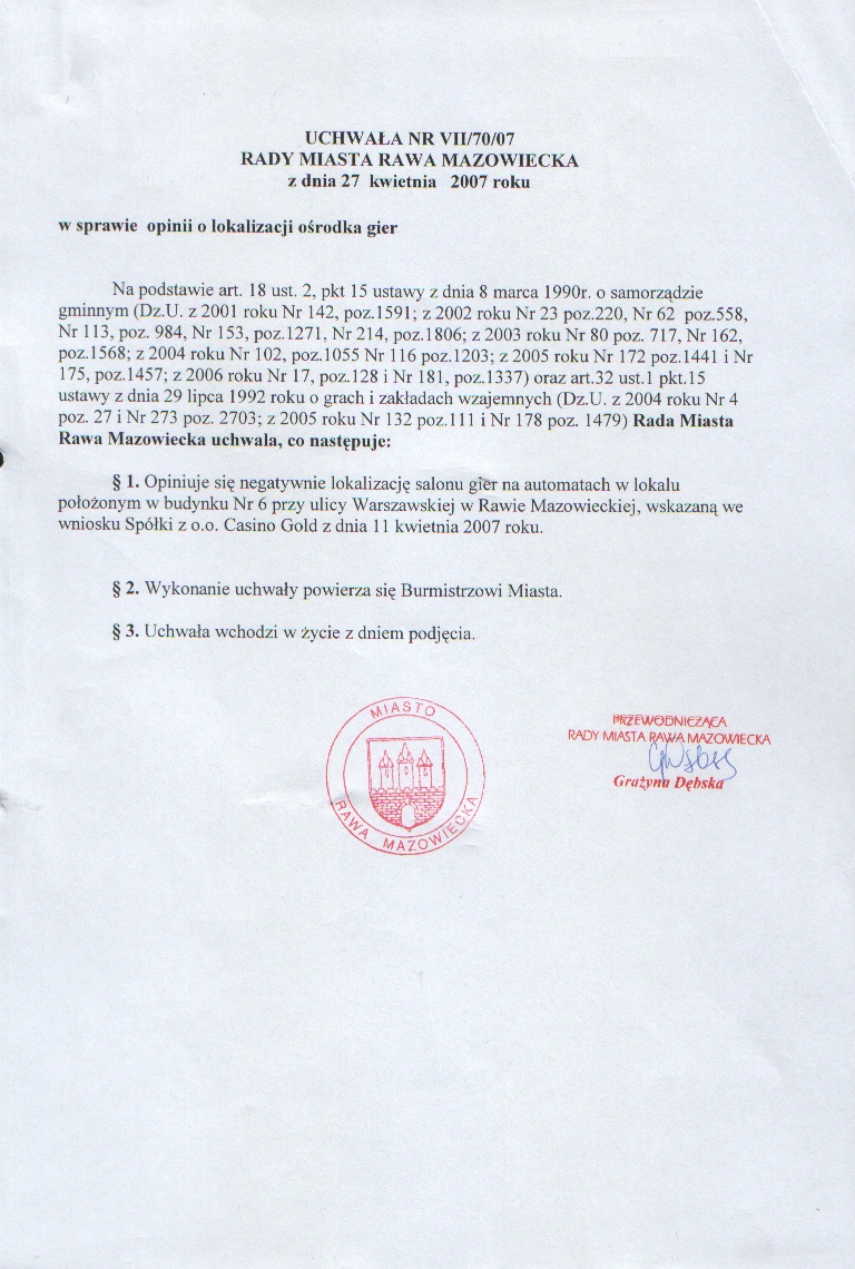 Uchwała nr VII/70/07 z dnia 27 kwietnia 2007 r. w sprawie opinii o lokalizacji ośrodka gier