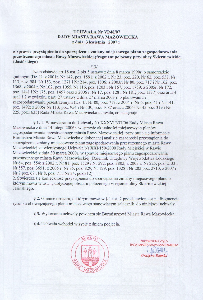 Uchwała nr VI/48/07 z dnia 3 kwietnia 2007 r. w sprawie przystąpienia do sporządzenia zmiany miejscowego planu zagospodarowania przestrzennego miasta Rawy Mazowieckiej /13/