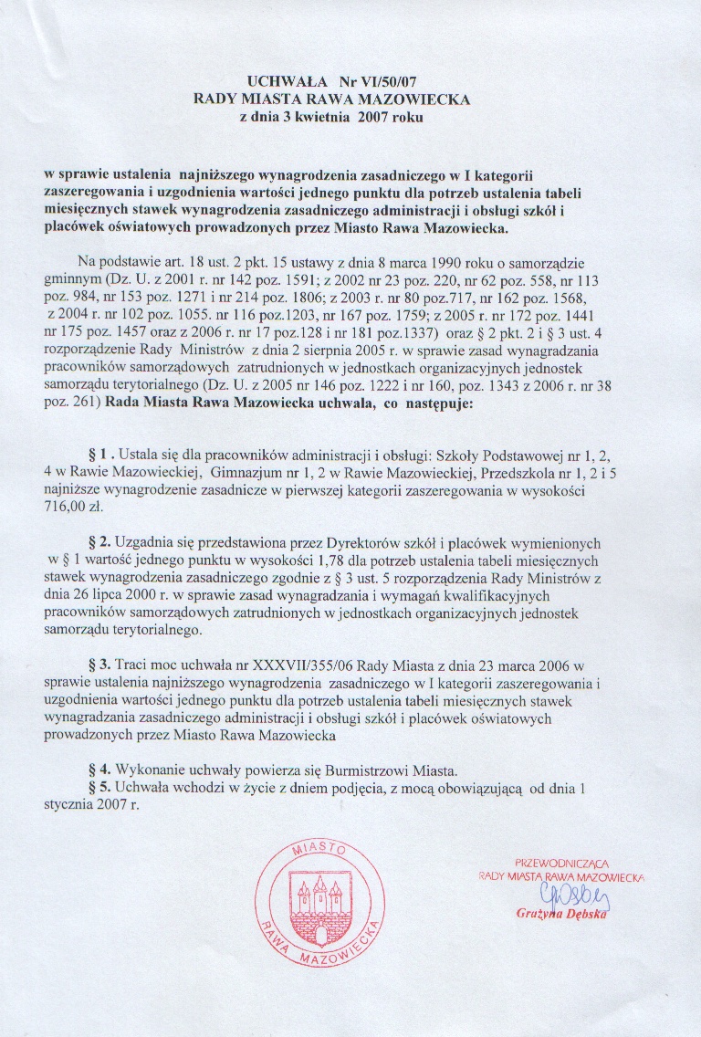 Uchwała nr VI/50/07 - z dnia 3 kwietnia 2007 r. w sprawie ustalenia najniższego wynagrodzenia zasadniczego