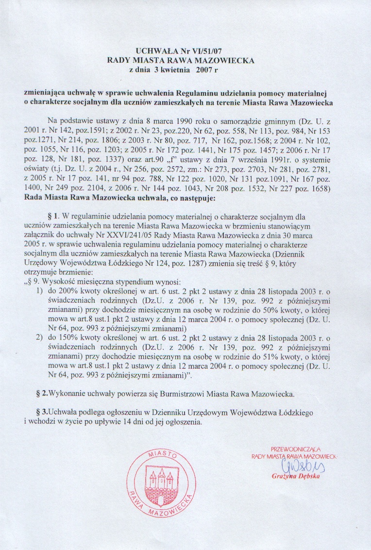 Uchwała nr VI/51/07 z dnia 3 kwietnia 2007 r. zmieniająca uchwałę w sprawie uchwalenia Regulaminu udzielania pomocy materialnej o charakterze socjalnym dla uczniów zamieszkałych na terenie Miasta Rawa Mazowiecka.