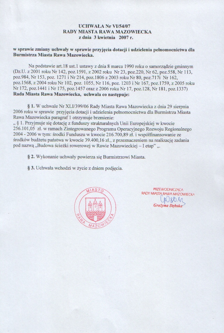 Uchwała nr VI/54/07 z dnia 3 kwietnia 2007 r. w sprawie zmiany uchwały w sprawie przyjęcia dotacji i udzielenia pełnomocnictwa dla Burmistrza Miasta Rawa Mazowiecka.