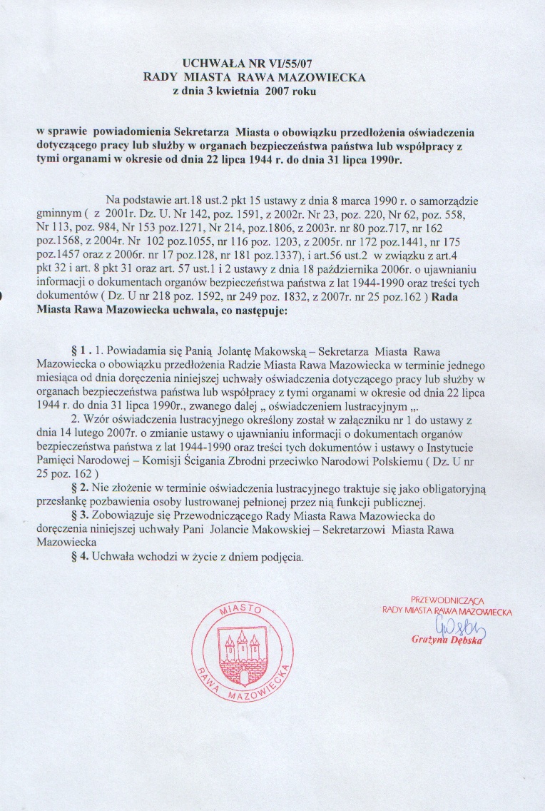 Uchwała nr VI/55/07 z dnia 3 kwietnia 2007 r.w sprawie powiadomienia Sekretarza Miasta o obowiązku przedłożenia oświadczenia dotyczącego pracy lub służby w organach bezpieczeństwa państwa