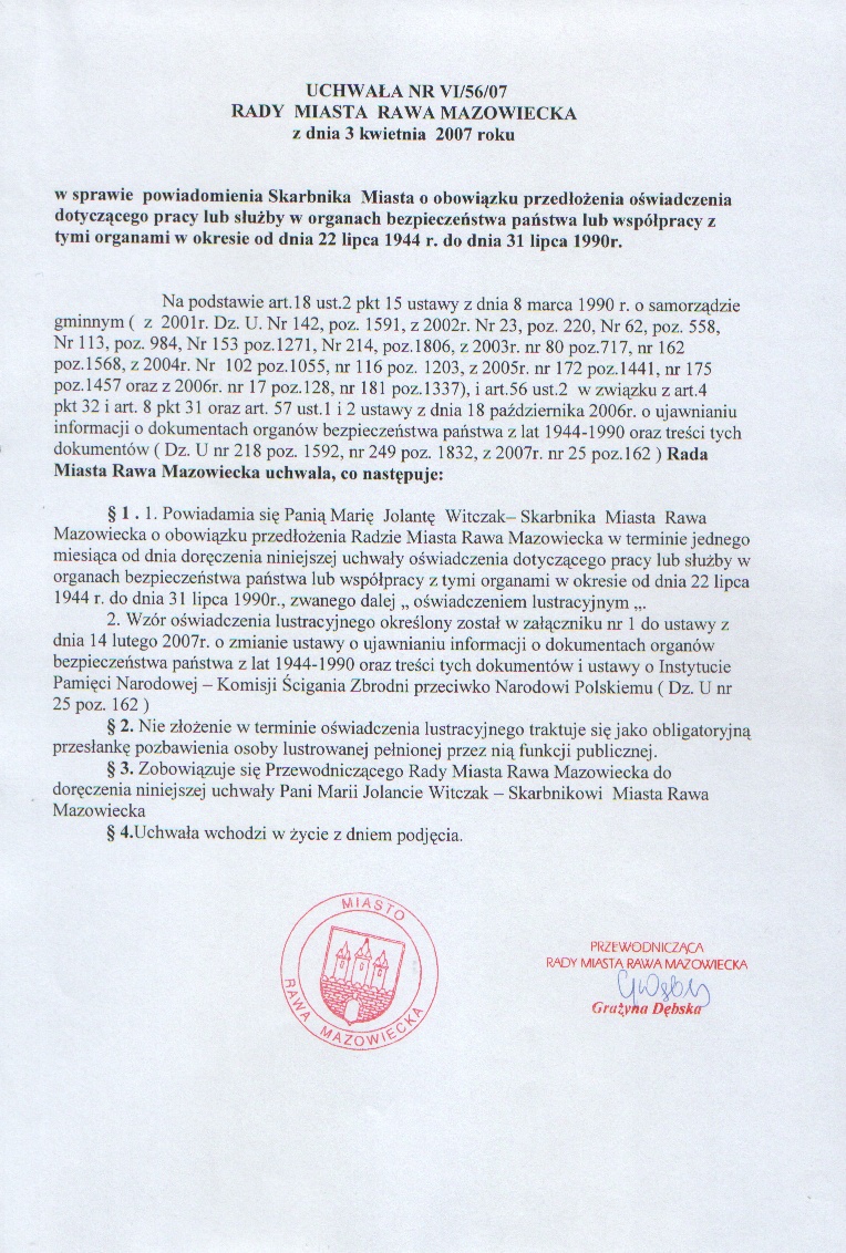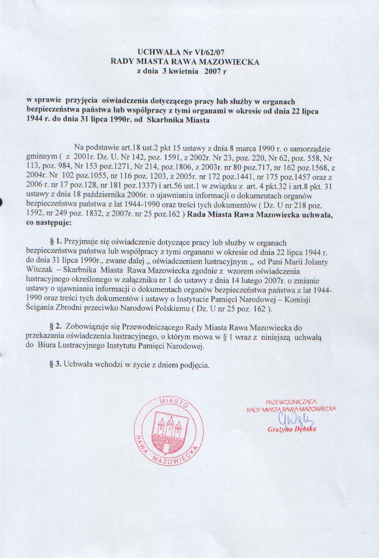 Uchwała nr VI/62/07z dnia 3 kwietnia 2007 r. w sprawie przyjęcia oświadczenia dotyczącego pracy lub służby w organach bezpieczeństwa państwa lub współpracy z tymi organami w okresie od dnia 22 lipca 1944 r. do dnia 31 lipca 1990r. od Skarbnika