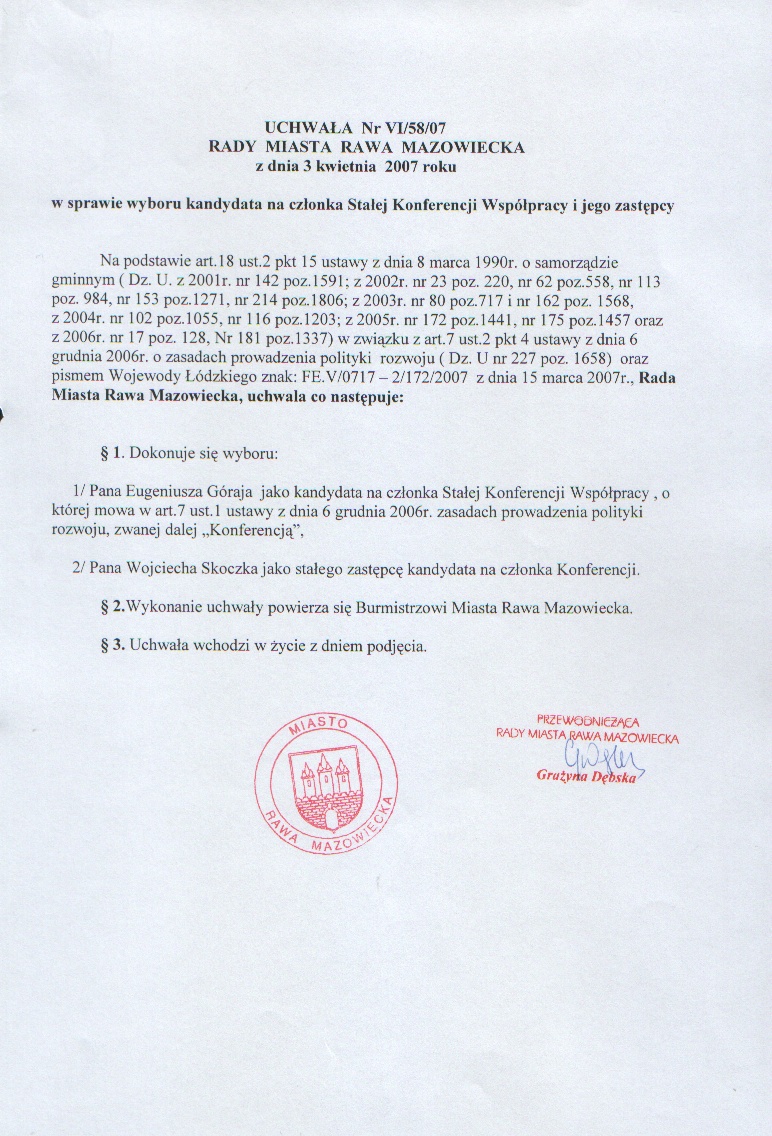 Uchwała nr VI/58/07 z dnia 3 kwietnia 2007 r. w sprawie wyboru kandydata na członka Stałej Konferencji Współpracy i jego Zastępcy.