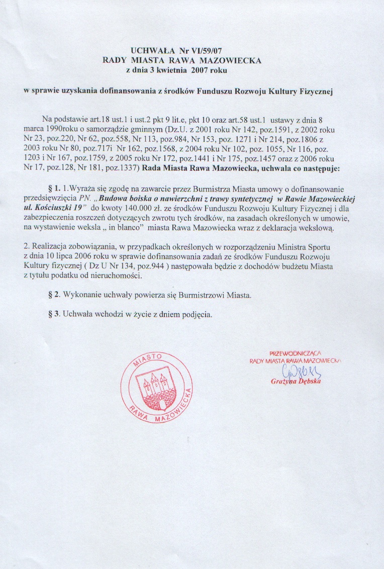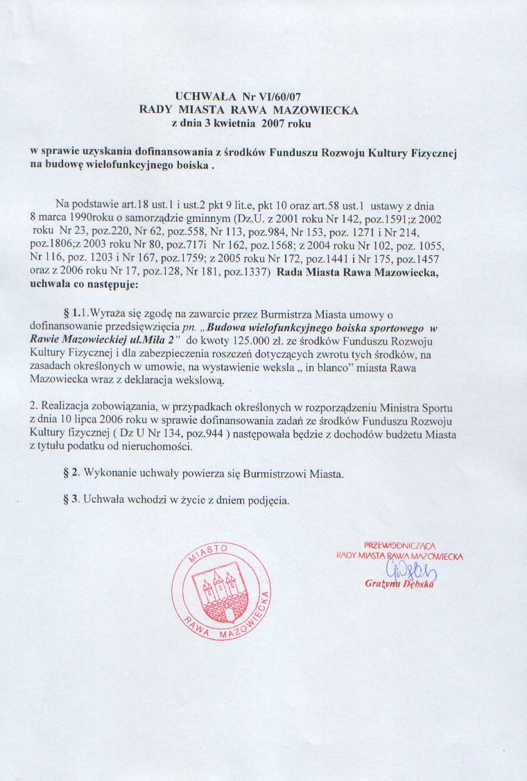 Uchwała nr VI/60/07 z dnia 3 kwietnia 2007 r. w sprawie uzyskania dofinansowania ze środków Funduszu Rozwoju Kultury Fizycznej na budowę wielofunkcyjnego boiska.