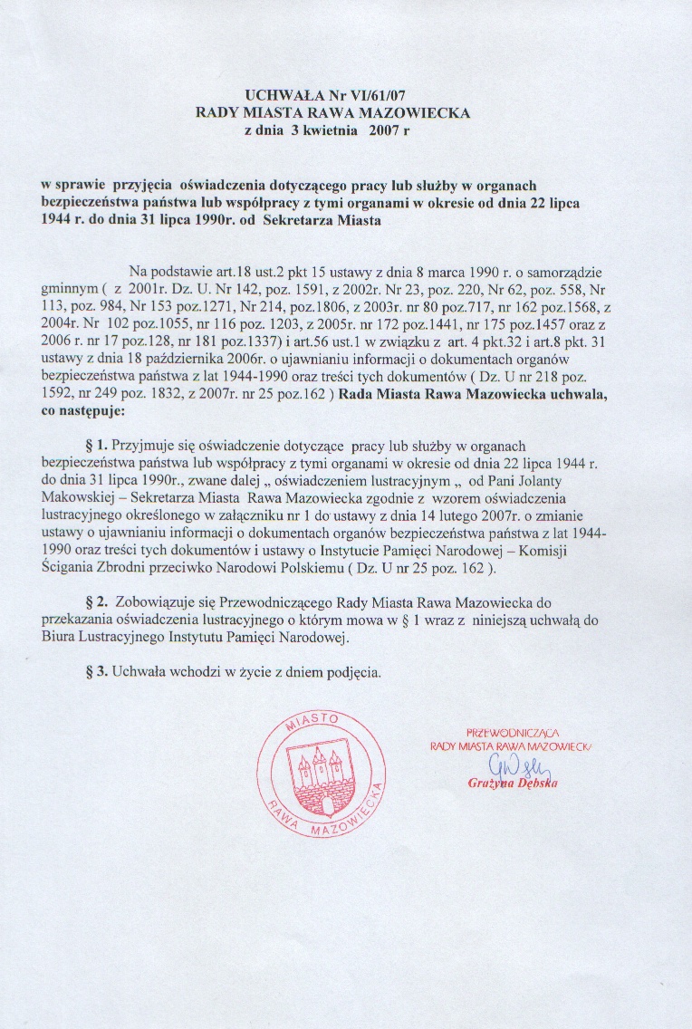 Uchwała nr VI/61/07 z dnia 3 kwietnia 2007 r. w sprawie przyjęcia oświadczenia dotyczącego pracy lub służby w organach bezpieczeństwa państwa lub współpracy z tymi organami w okresie od dnia 22 lipca 1944 r. do dnia 31 lipca 1990r. od Sekretarza