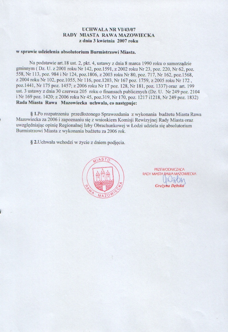 Uchwała nr VI/43/07 z dnia 3 kwietnia 2007 r. w sprawie udzielenia absolutorium