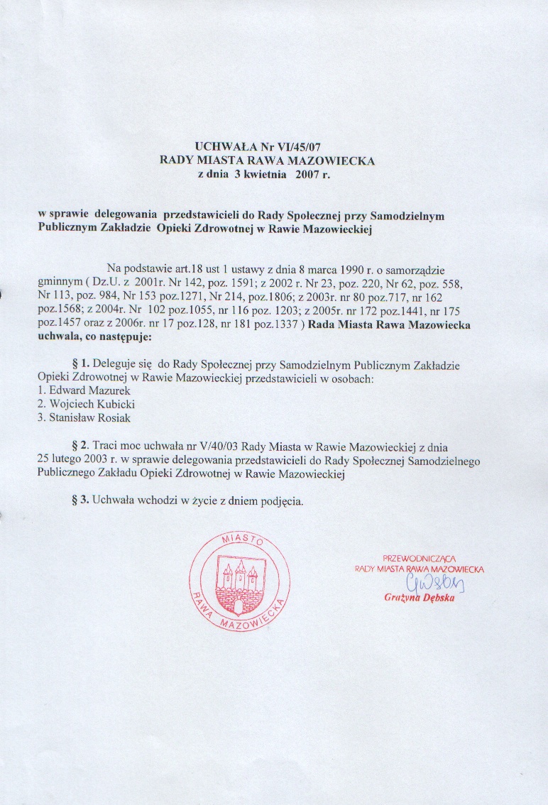 Uchwała nr VI/45/07 z dnia 3 kwietnia 2007 r. w sprawie delegowania przedstawicieli do Rady Społecznej przy Samodzielnym Publicznym Zakładzie Opieki Zdrowotnej w Rawie Mazowieckiej.