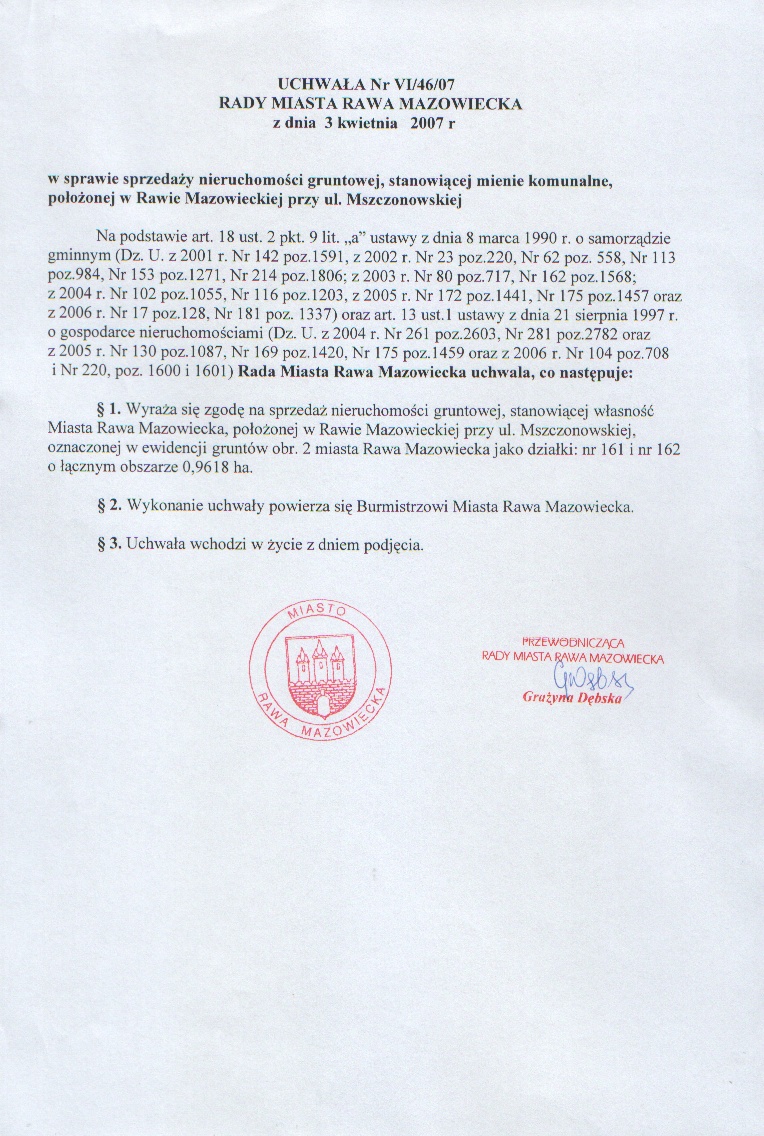 Uchwała nr VI/46/07 z dnia 3 kwietnia 2007 r. w sprawie sprzedaży nieruchomości gruntowej, stanowiącej mienie komunalne, położonej w Rawie Mazowieckiej przy ulicy Mszczonowskiej.