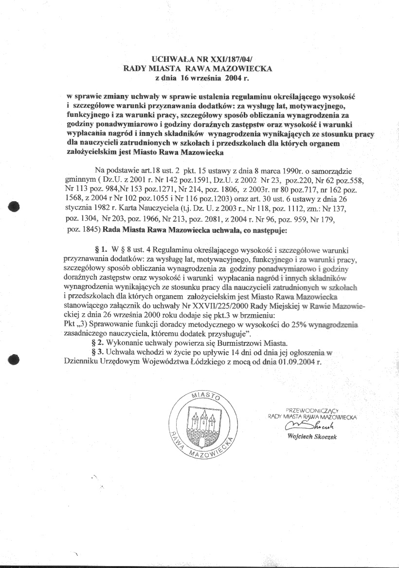 UCHWAŁA NR XXI/187/04 z dnia 16 września 2004 r. w sprawie zmiany uchwały w sprawie ustalenia regulaminu określającego wysokość i szczegółowe warunki przyznawania dodatków:za wysługę lat,motywacyjnego,funkcyjnegom i za warunki pracy...