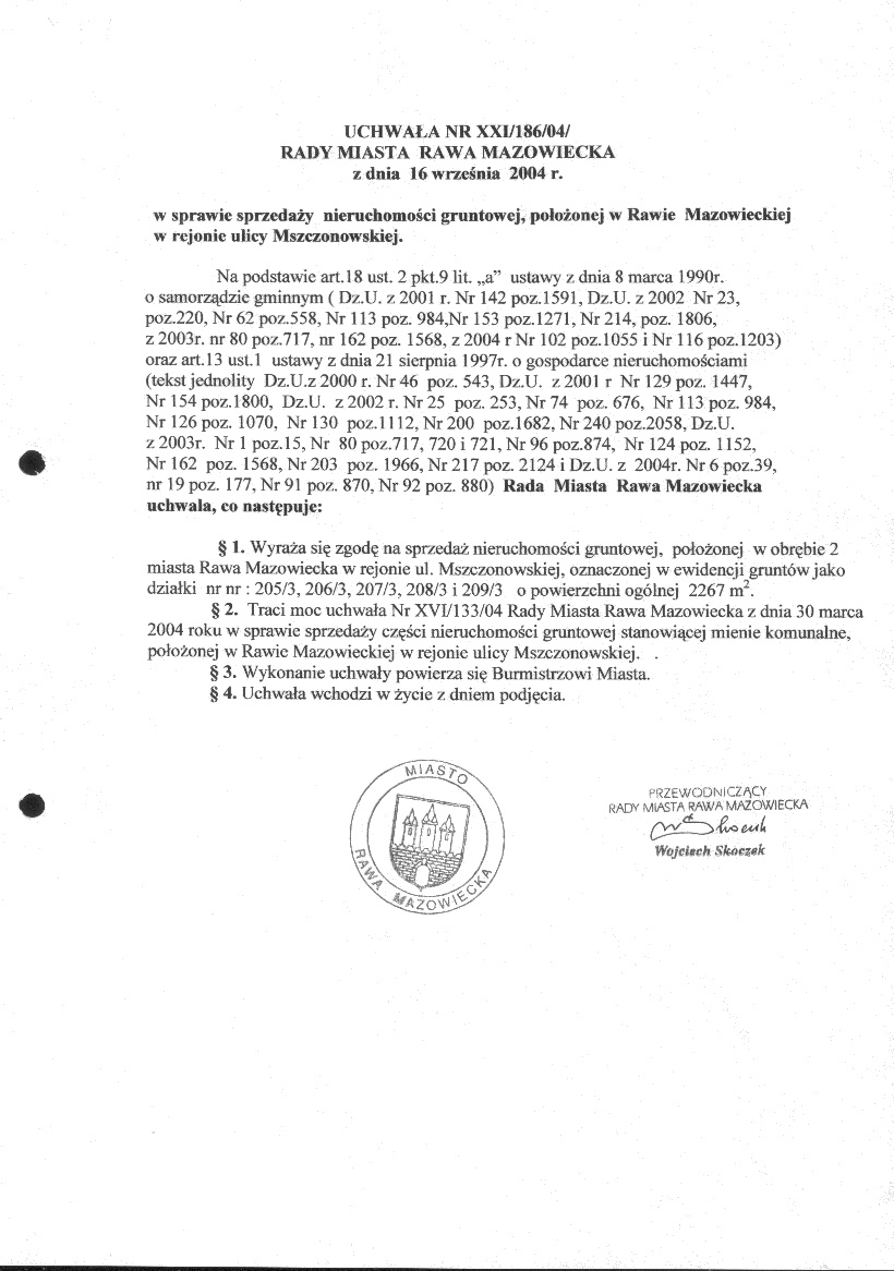 UCHWAŁA NR XXI/186/04 z dnia 16 września 2004 r. w sprawie sprzedaży nieruchomości gruntowej, położonej w Rawie Mazowieckiej w rejonie ulicy Mszczonowskiej