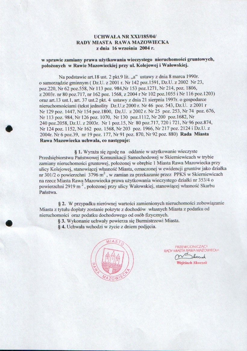 UCHWAŁA NR XXI/185/04 z dnia 16 września 2004 r. w sprawie zamiany prawa użytkowania wieczystego nieruchomości gruntowych, położonych w Rawoe Mazowieckiej przy ul. Kolejowej i Wałowskiej