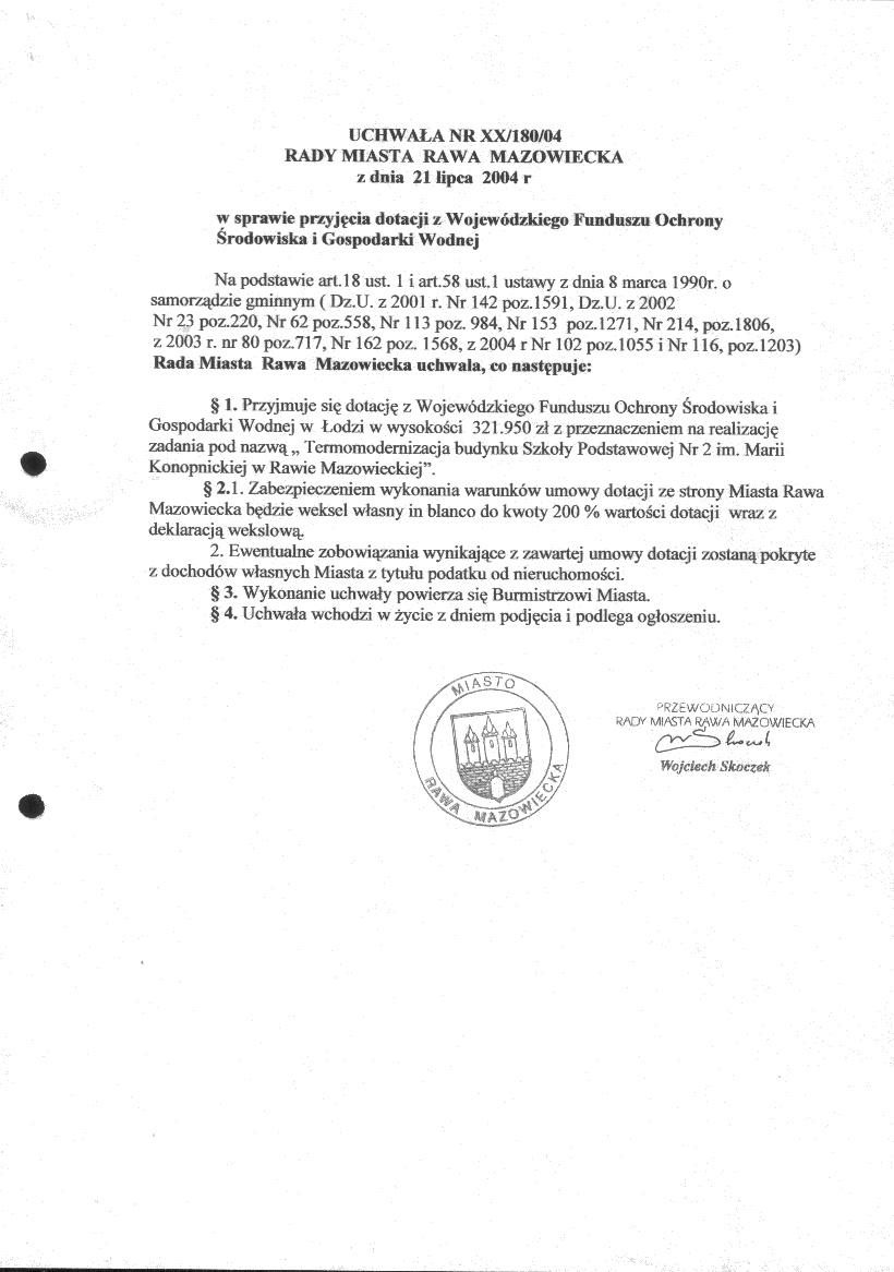 UCHWAŁA NR XX/180/04 z dnia 21 lipca 2004 r. w sprawie przyjęcia dotacji z Wojewódzkiego Funduszu Ochrony Środowiska i Gospodarki Wodnej