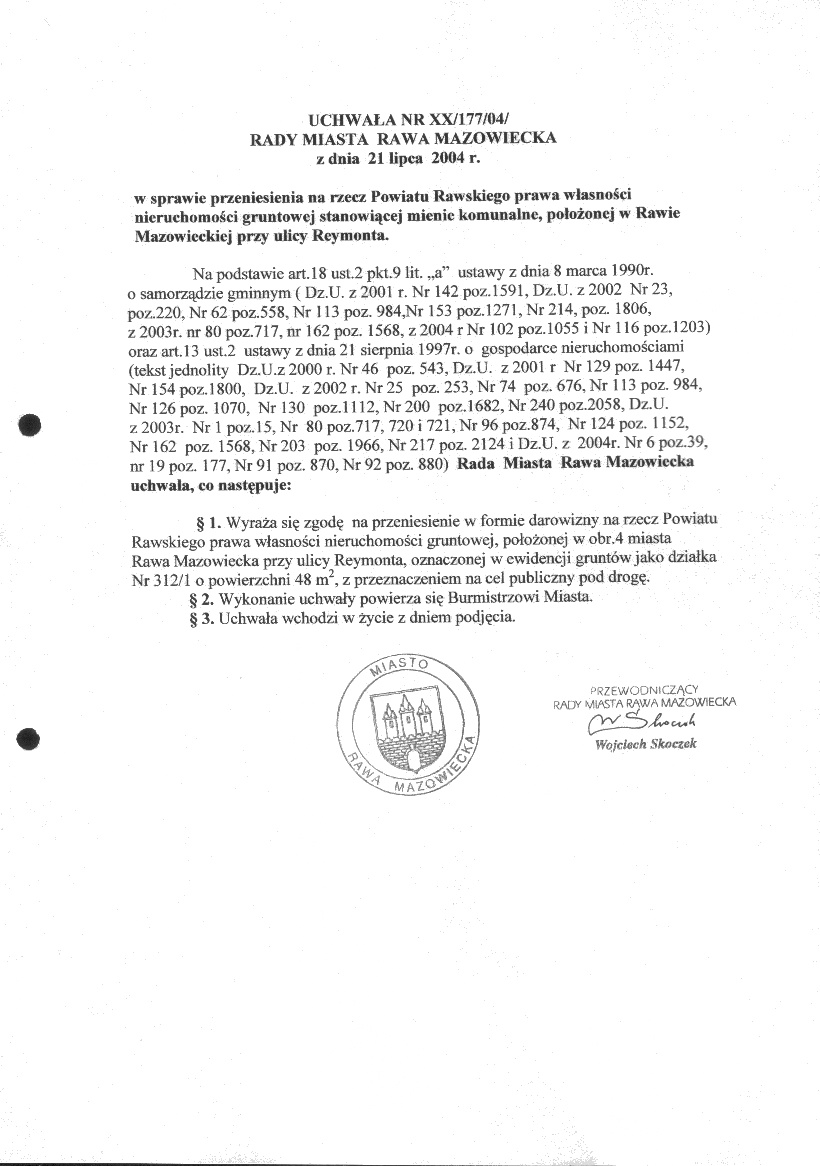 UCHWAŁA NR XX/177/04 z dnia 21 lipca 2004 r. w sprawie przeniesienia na rzecz Powiatu rawskiego prawa własności nieruchomości gruntowej stanowiącej mienie komunalne, położonej w Rawie Mazowieckiej przy ulicy Reymonta
