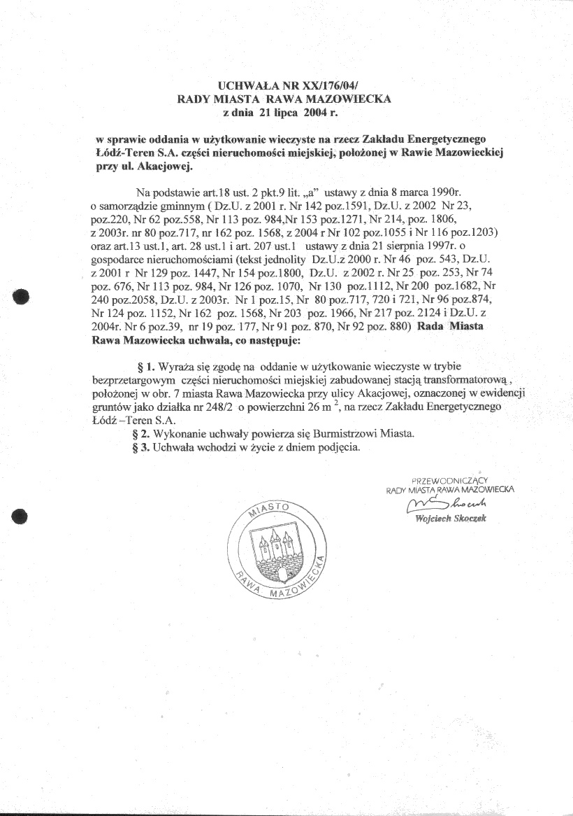 UCHWAŁA NR XX/176/04 z dnia 21 lipca 2004 r. w sprawie oddania w użytkowanie wieczyste na rzecz Zakładu Energetycznego Łódź-Teren S.A. części nieruchomości miejskiej, położonej w Rawie Mazowieckiej przy ul. Akacjowej