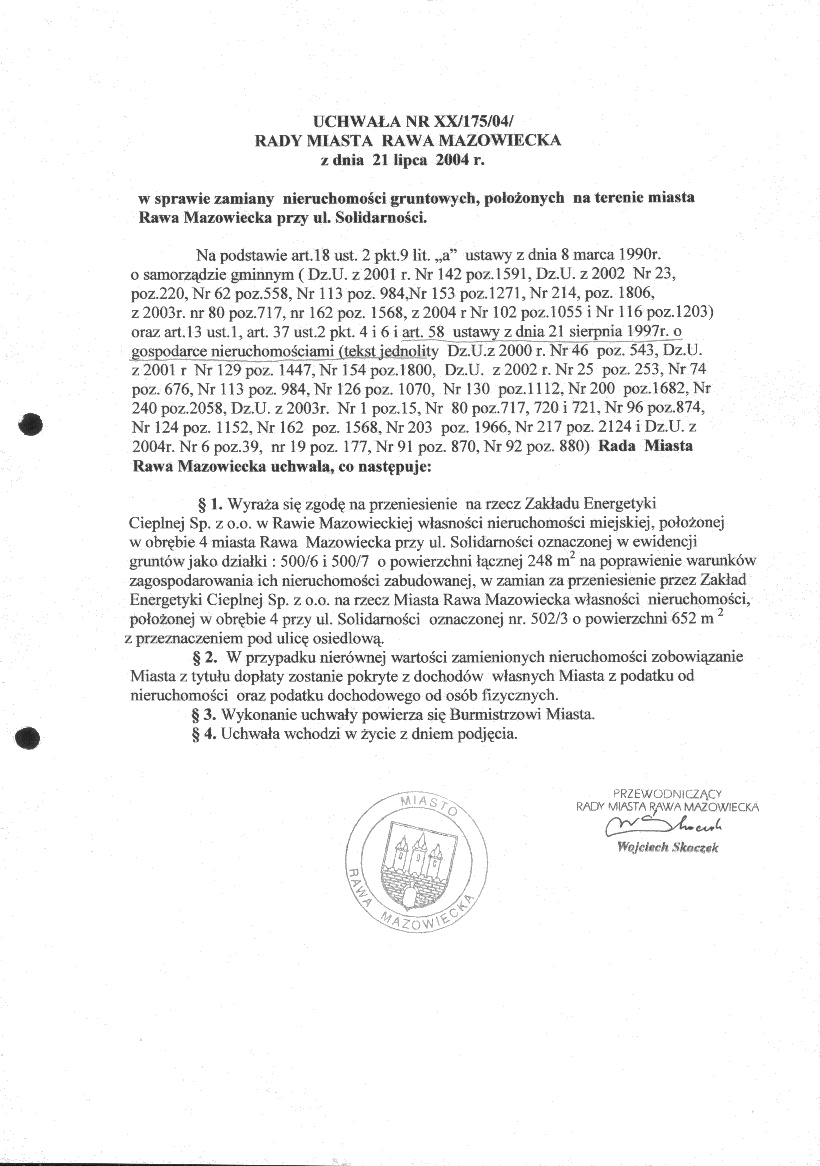 UCHWAŁA NR XX/175/04 z dnia 21 lipca 2004 r. w sprawie zamiany nieruchomości gruntowych, położonych na terenie miasta Rawa Mazowiecka przy ul. Solidarności