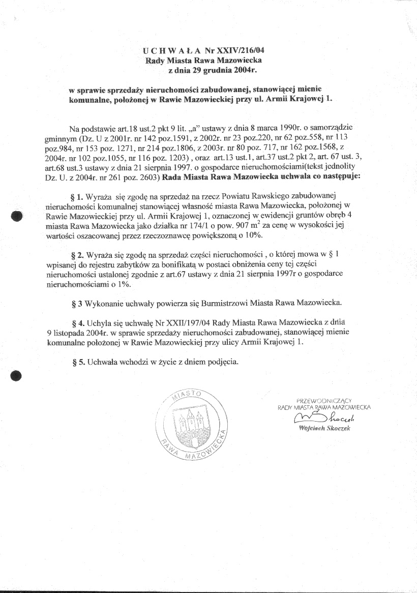 UCHWAŁA NR XXIV/216/04 z dnia 29 grudnia 2004 r. w sprawie sprzedaży nieruchomości zabudowanej, stanowiącej mienie komunalne, położonej w Raie Mazowieckiej przy ul. Armii Krajowej 1