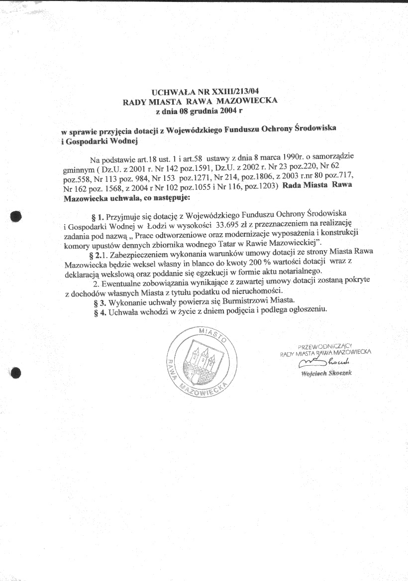 UCHWAŁA NR XXIII/213/04 z dnia 8 grudnia 2004 r. w sprawie przyjęcia dotacji z Wojewódzkiego Funduszu Ochrony Środowiska i Gospodarki Wodnej