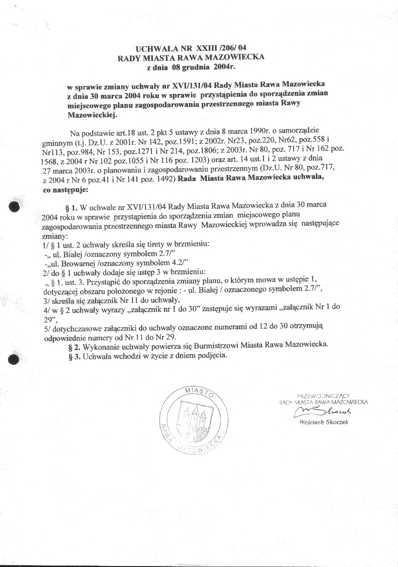 UCHWAŁA NR XXIII/206/04 z dnia 8 grudnia 2004 r. w sprawie zmiany uchwały nr XVI/131/04 Rady Miasta Rawa Mazowiecka z dn. 30 marca 2004 r. w sprawie przystąpienia do sporządzenia zmian miejscowego planu zagospodarowania przestrzennego m. Rawy Mazowieckiej