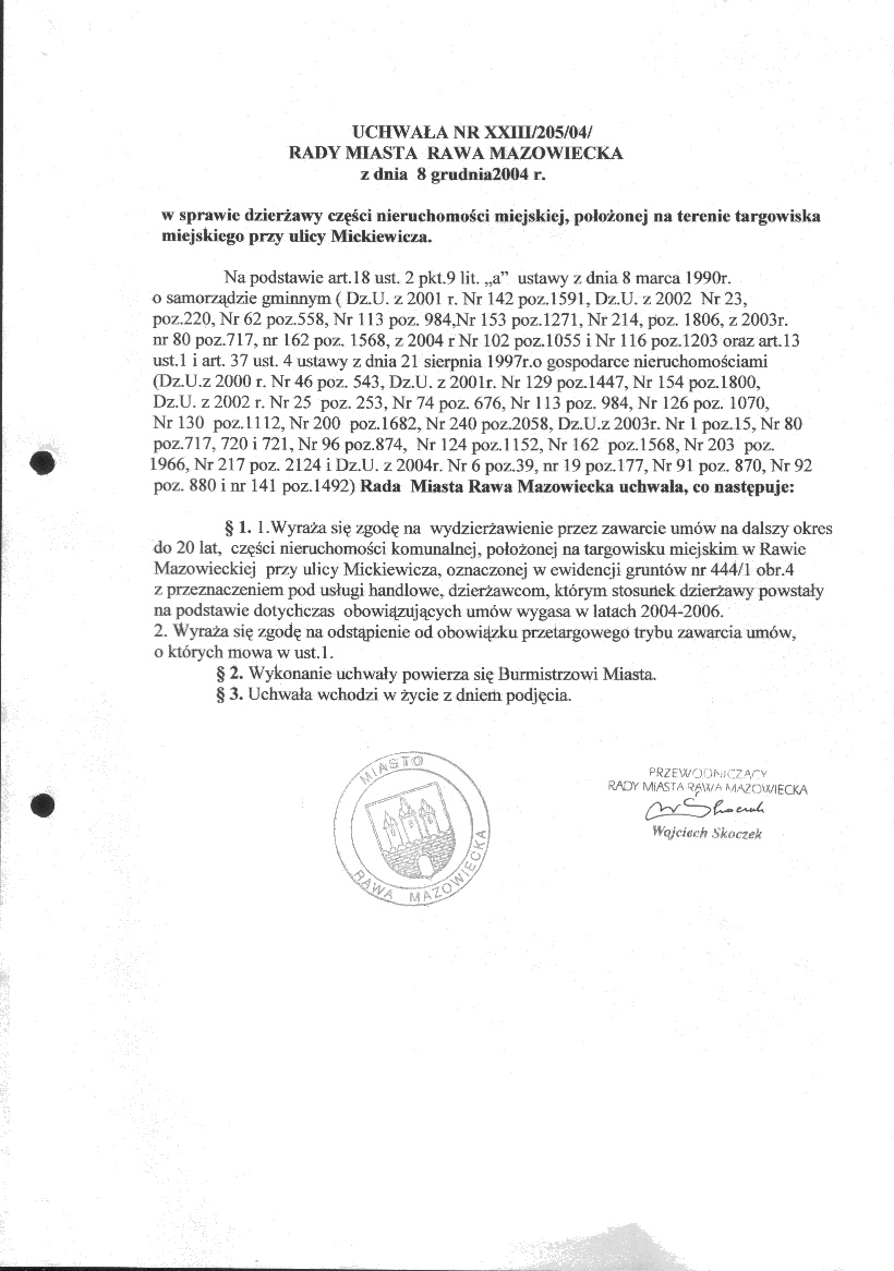 UCHWAŁA NR XXIII/205/04 z dnia 8 grudnia 2004 r. w sprawie dzierżawy części nieruchomości miejskiej, położonej na terenie targowiska miejskiego przy ulicy Mickiewicza