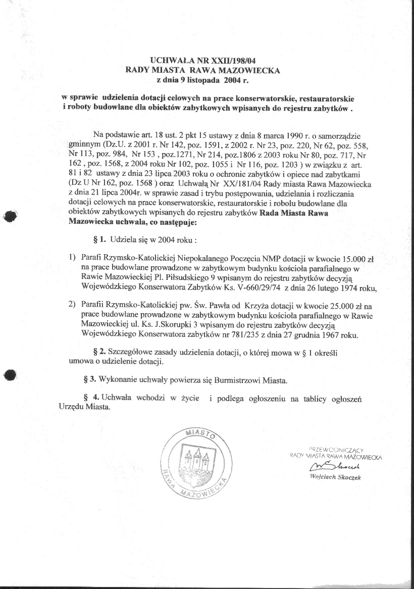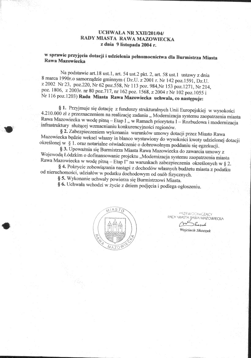 UCHWAŁA NR XXII/201/04 z dnia 9 listopada 2004 r. w sprawie przyjęcia dotacji i udzielenia pełnomocnictwa dla Burmistrza Miasta Rawa Mazowiecka