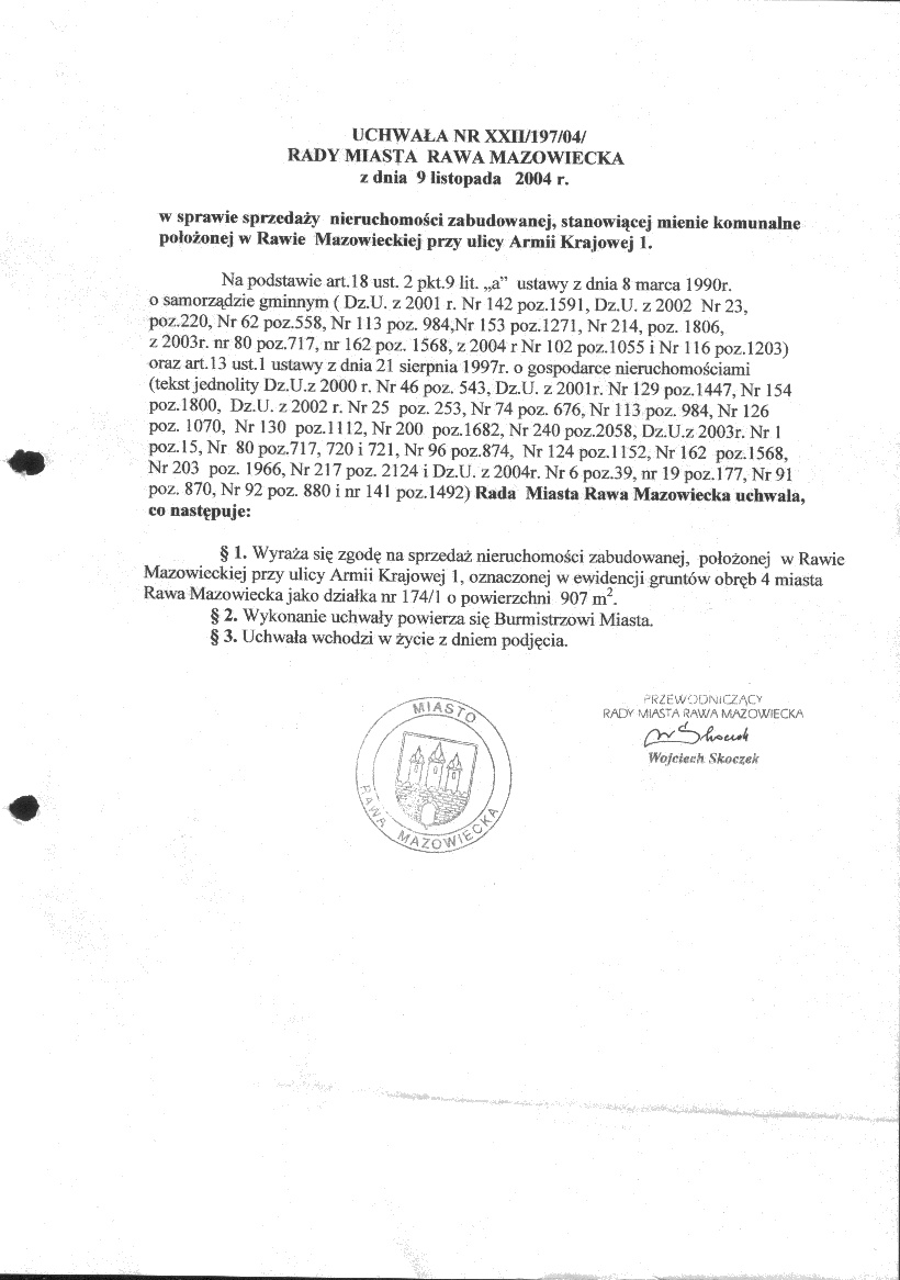 UCHWAŁA NR XXII/197/04 z dnia 9 listopada 2004 r. w sprawie sprzedaży nieruchomości niezabudowanej, stanowiącej mienie komunalne położonej w Rawie Mazowieckiej przy ulicy Armii Krajowej 1