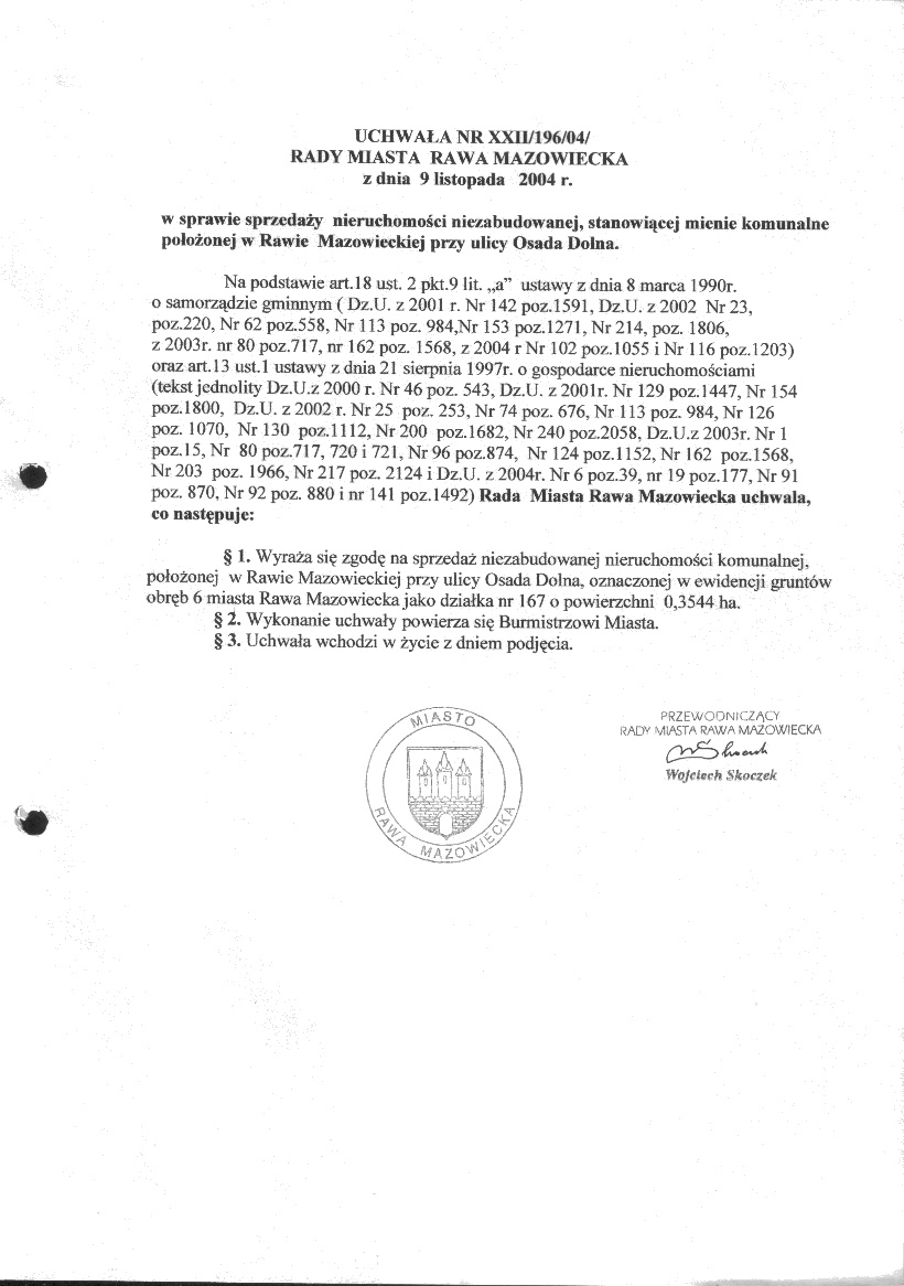UCHWAŁA NR XXII/196/04 z dnia 9 listopada 2004 r. w sprawie sprzedaży nieruchomości niezabudowanej, stanowiącej mienie komunalne położonej w Rawie Mazowieckiej przy ulicy Osada Dolna