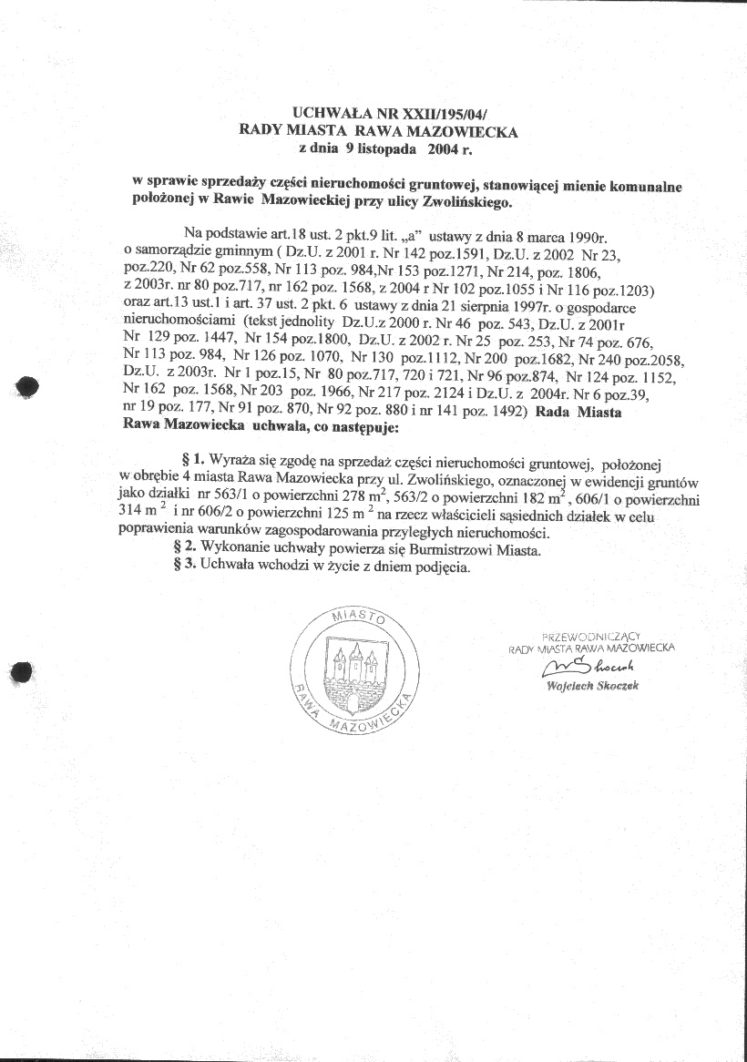 UCHWAŁA NR XXII/195/04 z dnia 9 listopada 2004 r. w sprawie sprzedaży częsci nieruchomości gruntowej, stanowiącej mienie komunalne położonej w Rawie Mazowieckiej przy ulicy Zwolińskiego
