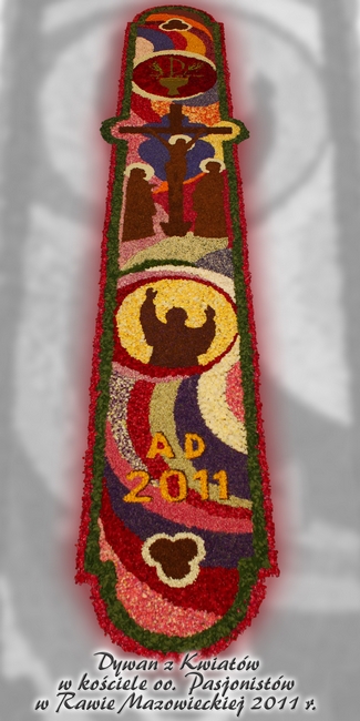 Zakończenie Oktawy Bożego Ciała już niebawem. Trwają więc przygotowania do usypania kobierca z płatków kwiatów w kościele oo. Pasjonistów. Wszystkich chętnych do zaangażowania się w powstanie tego oryginalnego dzieła zapraszamy w środę. W godzinach popołudniowych, na posadzce świątyni pojawi się kwiatowy dywan, wykonany wg zamysłu artysty – plastyka, Rajmunda Gałeckiego.