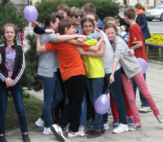 Można było również przytulić Rawę wirtualnie na specjalnie przygotowanych stanowiskach komputerowych. Dzieci wzięły udział w konkursie plastycznym, a bardziej sprawni sportowo mogli skorzystać z rowerowego trenażera stacjonarnego. Niesamowite wrażenia wzbudziły pokazy taneczne grupy Kobos Dance. Był i słodki akcent naszego spotkania. Czekoladki milka dla każdego pokrzepiały, a opaski z hasłem „Przytul mnie” podkreślały najważniejszy cel happeningu.
