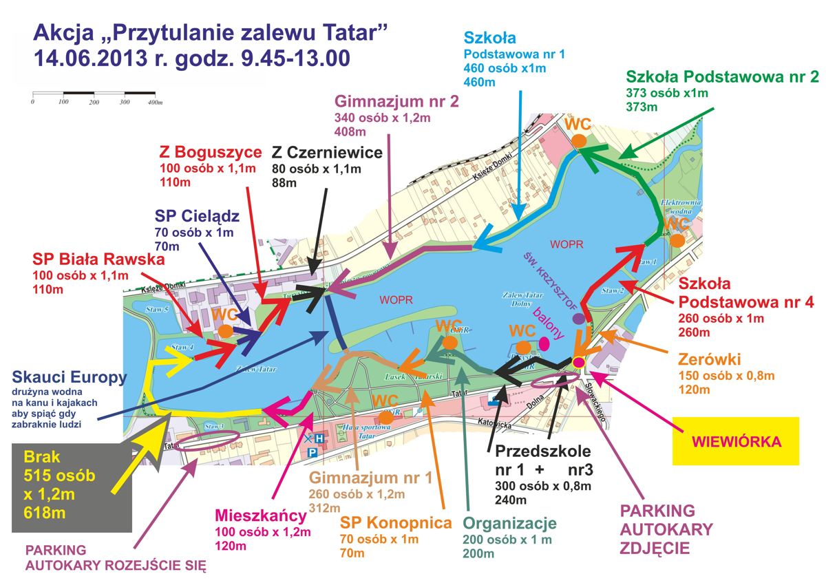 A będzie to rzeczy niebywała, ponieważ zalew Tatar to ponad 50 ha powierzchnia wody, a trakt pieszo-rowerowy, który będzie wyznaczał ramy naszego przedsięwzięcia liczy ok. 3,5 km. Taka próba to konieczność uczestnictwa około 4 tysięcy mieszkańców naszego miasta.