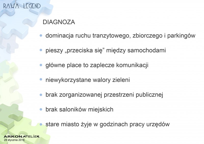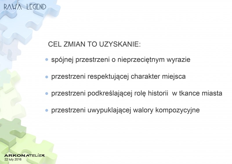 Przez kilkanaście minionych lat przeprowadzono wiele inwestycji poza historycznym centrum miasta. Zadbano m.in. o bazę oświatową, kulturalną, rekreacyjno – sportową, wybudowano lub wyremontowano drogi, położono infrastrukturę podziemną, wykonano termomodernizację obiektów.Samo centrum Rawy czyli miejsce, do którego przyjezdni kierują zazwyczaj swoje pierwsze kroki, pod tym względem nie zostało doinwestowane. A tym samym przez lata nie zmieniła się jego funkcjonalność. Często mówi się o nim jak o gigantycznym parkingu, miejscu bez charakteru. A jest to teren objęty strefą ścisłej ochrony konserwatorskiej. Ma więc duży potencjał kulturowy i reprezentacyjny.