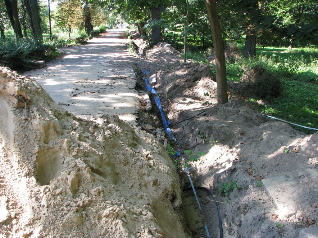 Tempa nabierają także roboty w parku. Po etapie demontażu małej architektury oraz słupów oświetleniowych, przeprowadzono prace ziemne, polegające na budowie linii kablowej oświetlenia i monitoringu. Do końca zbliżają się roboty pomiarowe, niezbędne m.in. do wytyczenia nowego układu ścieżek. Jesienią rozpoczną się natomiast prace pielęgnacyjne związane z drzewostanem oraz roboty związane z wykonaniem podbudowy dla nowych alejek parkowych.