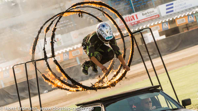 Kolejna odsłona pokazu to konkurencje motocyklowe. Polecane przez nas to te najbardziej widowiskowe: skoki nad kaskaderami ułożonymi na torze, skok motocyklem przez jadące auto oraz Globe of Death (Globus Śmierci) – dla widzów o bardzo silnych nerwach.