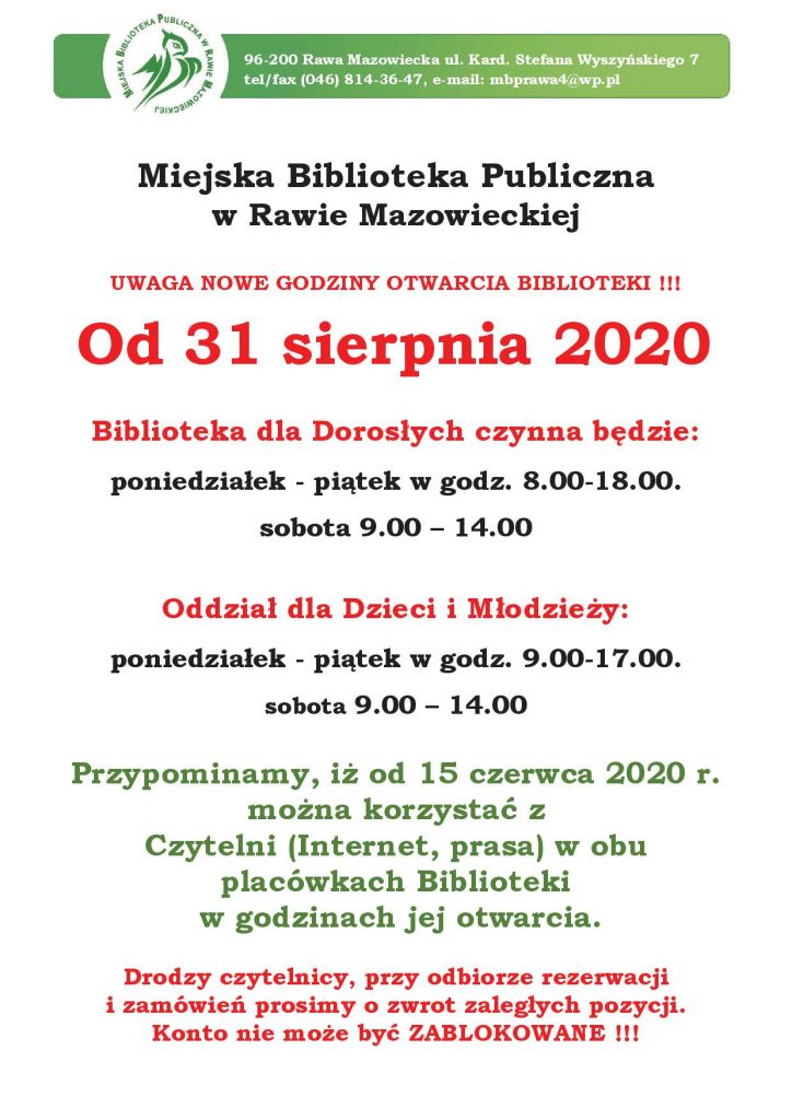 Kończą się wakacje i miejska biblioteka przy ul. Wyszyńskiego wraca do swoich standardowych godzin otwarcia. W tygodniu bibliotekarze (oddział dla dorosłych) pracują do godz. 18.00, a w soboty - do godz. 14.00. Przy korzystaniu z biblioteki nadal obowiązują zasady reżimu sanitarnego.