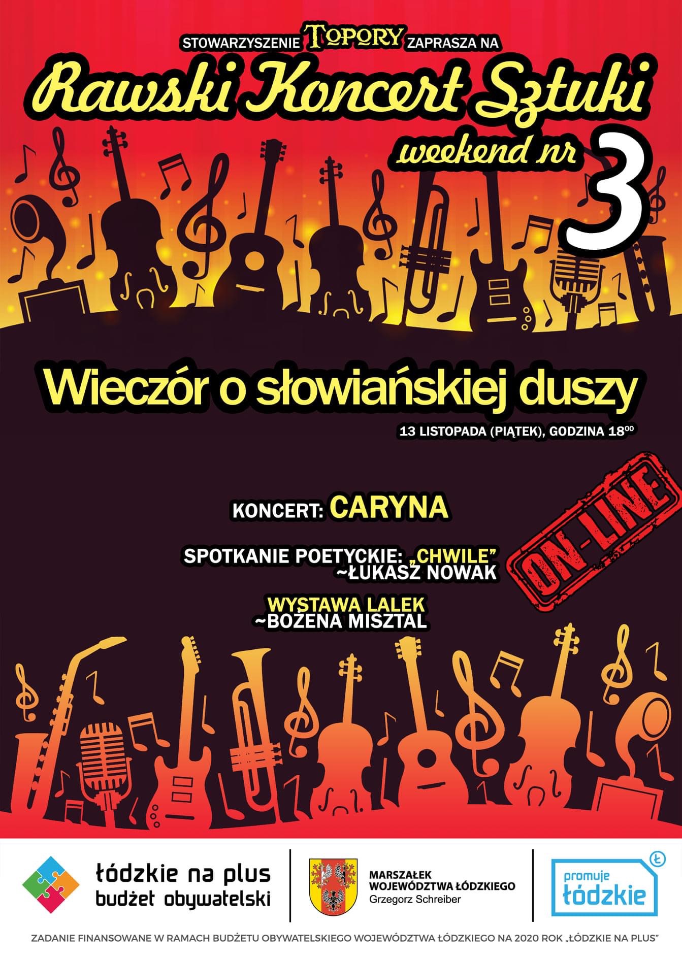 Rawskie stowarzyszenie Topory zaprasza na kolejne wydarzenie z cyklu „Rawski Koncert Sztuki”. Tym razem motywem przewodnim będzie słowiańska dusza. Wieczór otworzy Łukasz Nowak - osoba wielu pasji i wielu talentów. Na co dzień nauczyciel, wieczorami zawodowy muzyk i poeta. Będą więc wiersze, będzie i muzyka. Łukasz Nowak wystąpi też ze swoim zespołem - Caryna.
