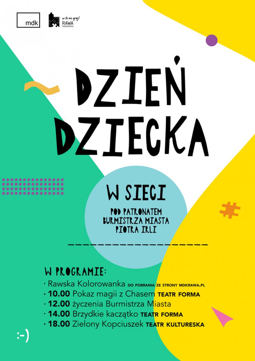 W dniu 1 czerwca z okazji Dnia Dziecka Miejski Dom Kultury przygotował dla naszych najmłodszych „DZIEŃ DZIECKA w sieci". Atrakcje, ze względu na obecne zagrożenie epidemiczne, będą dostępne w wersji on-line ” (całe wydarzenie będzie miało miejsce na facebook’owym profilu MDK). Patronat nad imprezą objął burmistrz Rawy Mazowieckiej Piotr Irla.