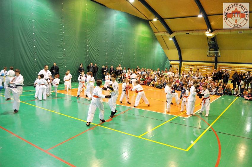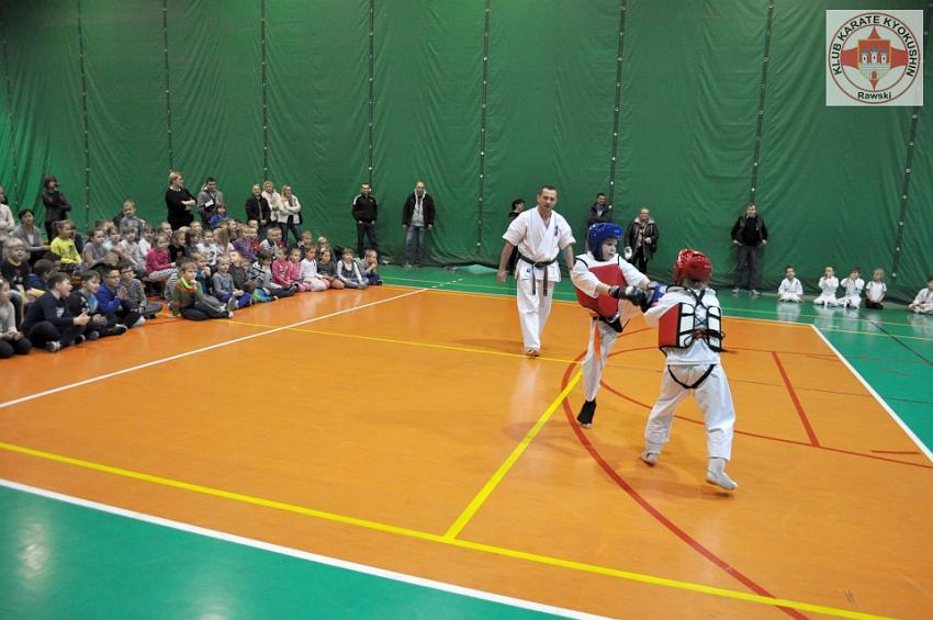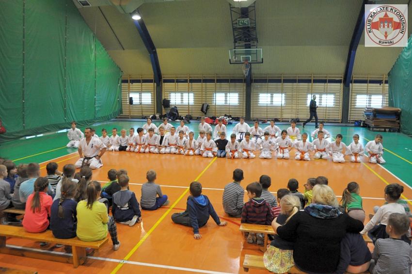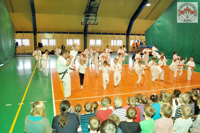 Po przywitaniu padły słowa przysięgi Dojo, którą to miłośnicy tej sztuki walki muszą się kierować na sali i w życiu. Następnie rawskie tygrysy przystąpiły do rozgrzewki. Po krótkim przygotowaniu sempai pokazali jak wspaniale są rozciągnięci. I tu pojawiły się pierwsze głosy zachwytu wśród zebranej publiczności. Szpagaty, sznurki, przewroty, gwiazdy wykonywane na jednym ręku czy mosty zapaśnicze raz po raz wywoływały poruszenie. W dalszej części pokazu nasi młodzi wojownicy zaprezentowali techniki kumite (walki) karate kyokushin oraz kata (układy doskonalące technikę). I tu ponownie szum zachwytu przebiegł przez salę. Punktem kulminacyjnym były walki pokazowe. Zawodnicy RKKK, ubrani w ochraniacze, zaprezentowali jak wyglądają ich zmagania na turniejach, w których startują, trzeba dodać - z niemałymi sukcesami. Uczniowie, nauczyciele oraz rodzice nagrodzili naszych zawodników gromkimi brawami.
