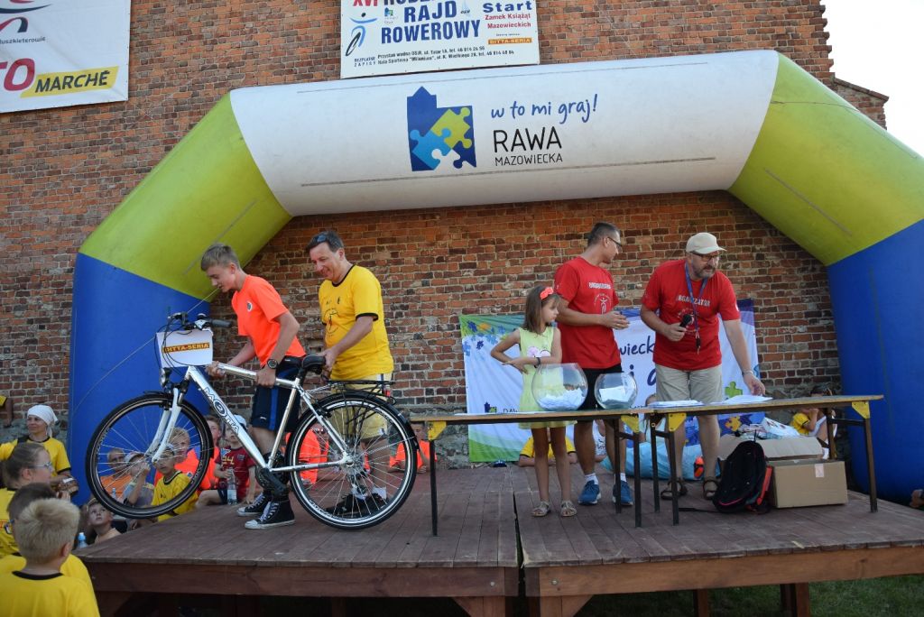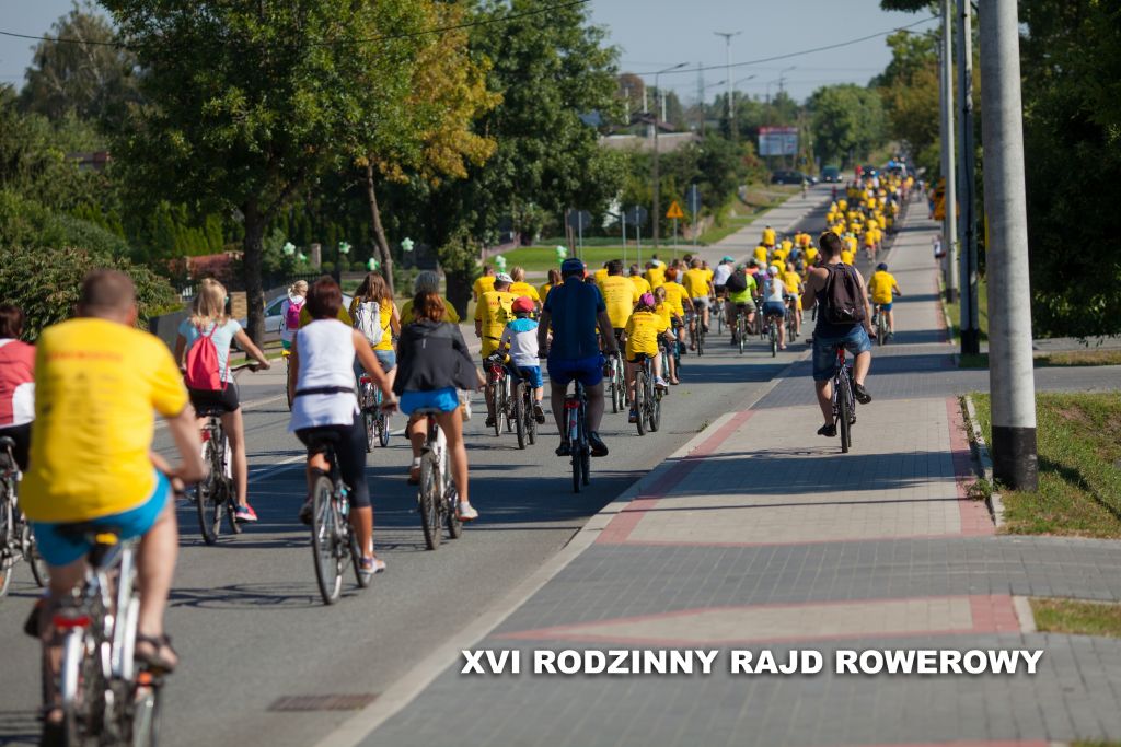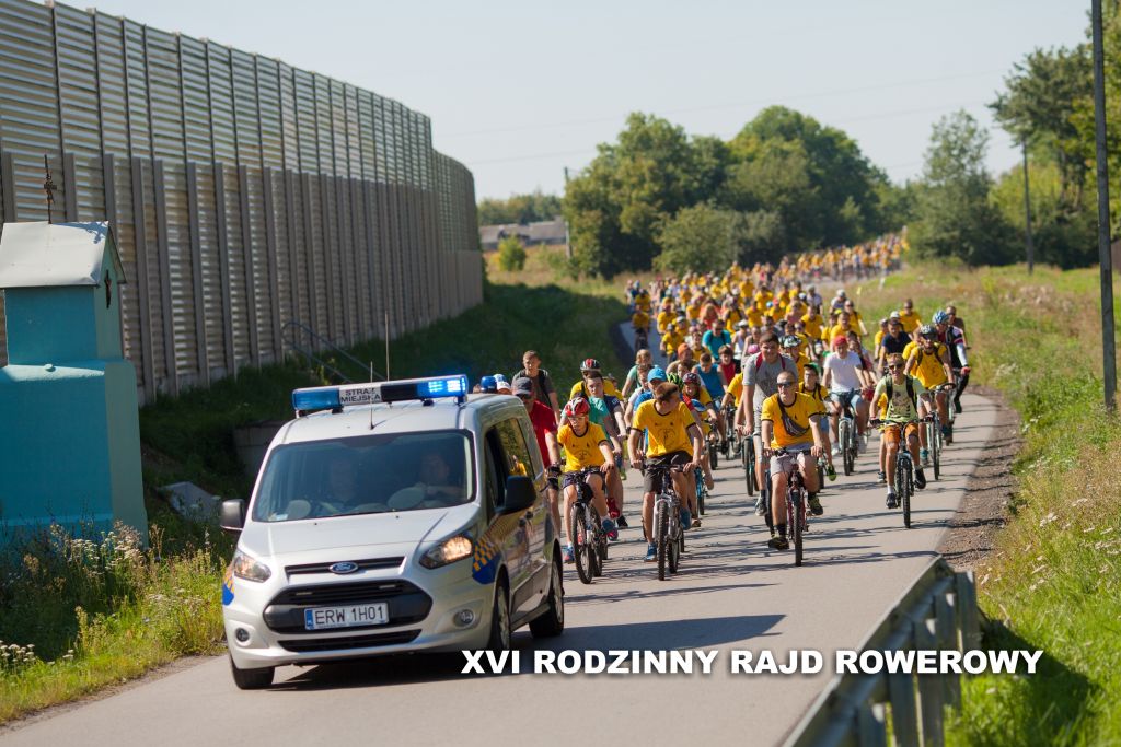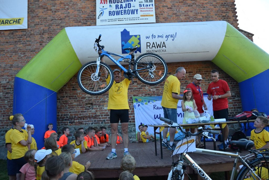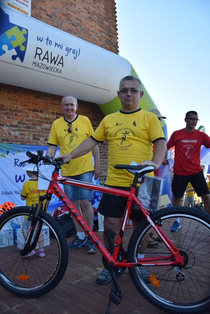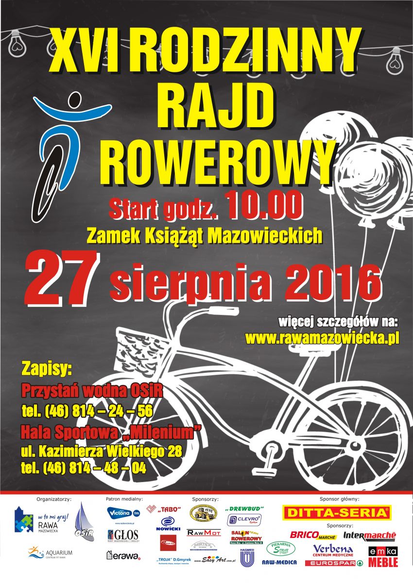 W ostatnią sobotę wakacji, czyli 27 sierpnia 2016 r., odbył się 16. Rawski Rodzinny Rajd Rowerowy. Na listę startową pisało się 772 miłośników jazdy na dwóch kółkach, w tym 51 rodzin (tyle zostało wypełnionych kuponów rodzinnych). Tym razem zarówno start jak i metę wyznaczono na dziedzińcu zamku Książąt Mazowieckich, skąd kilka minut po godz. 10 rajdowicze w żółtych koszulkach ufundowanych przez firmę Ditta Seria ruszyli na trasę liczącą około 35 km. Trasa biegła najpierw za osiedlem na "Sójczym Wzgórzu" a ulicami Chrobrego, Batorego i Mszczonowską, a następnie do miejscowości Julianów, Helenów, Jakubów i Przewodowice, gdzie po przejechaniu wiaduktu nad trasą S8 powieść w kierunku Teodozjowa do leśniczówki w Jelitowie, gdzie nastąpiła przerwa na odpoczynek. Po około 30-minutowej przerwie nastąpił powrót do Rawy Mazowieckiej najpierw duktem leśnym przez "las konopniński" a następnie drogą techniczną wzdłuż drogi ekspresowej S8 i znów ulicami za osiedlem na Sójczym Wzgórzu.
