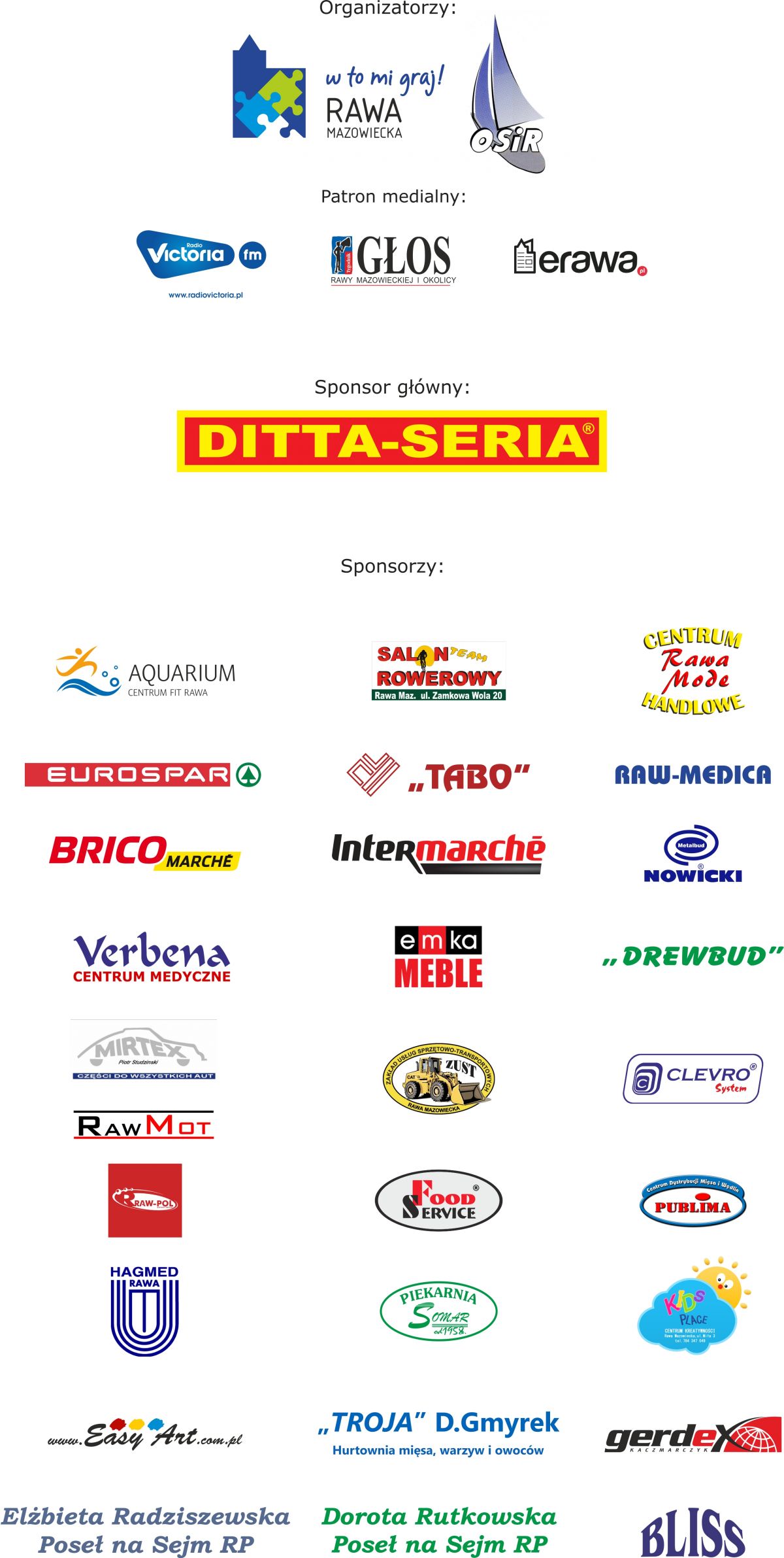Dziękujemy w szczególności sponsorowi głównemu - firmie DITTA SERIA. Składamy również podziękowania pozostałym sponsorom, bez pomocy których nie byłoby możliwe przeprowadzenie rajdu. Sponsorami rajdu byli: TABO, CLEVRO, RAW-POL, METALBUD, AQUARIUM spółka z o.o., ZUST, EUROSPAR, HAGMED, RAW MOT, MIRTEX, EMKA MEBLE, SOMAR, PUBLIMA, RAW – MEDICA, DREWBUD, RAWA MODE, RAWiK, Salon Rowerowy TEAM, TROJA, VERBENA, INTERMARCHE, BRICOMARCHE, FOOD-SERVICE, KIDS PLACE, EASY ART, GERDEX, BLISS. Tradycyjnie rawski rajd wspierały: Poseł na Sejm RP Elżbieta Radziszewska, która zakupiła wode mineralną dla uczestników rajdu i Poseł na Sejm RP Dorota Rutkowska. Wszystkim współpracującym firmom serdecznie dziękujemy.