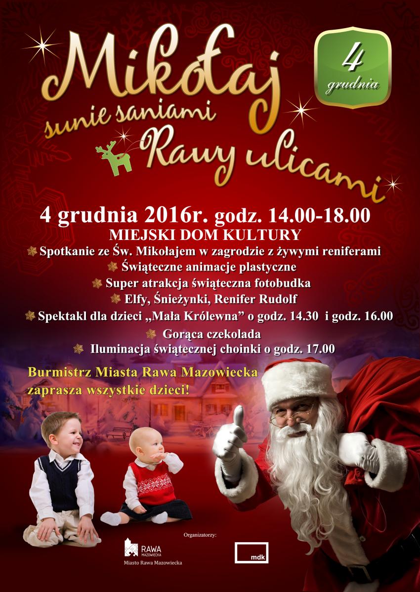„Mikołaj sunie saniami Rawy ulicami” - 4 grudnia 2016 r. odbyła się kolejna edycja rawskich mikołajek. Św. Mikołaj przyjechał zaprzęgiem reniferów i czekał na wszystkie dzieci. Po spotkaniu ze św. Mikołajem maluchy udały się do świata baśni w przedstawieniu „Mała królewna”, która w zabawny sposób wprowadziła najmłodszych w zimowy czas mikołajek i przygotowań do świąt.