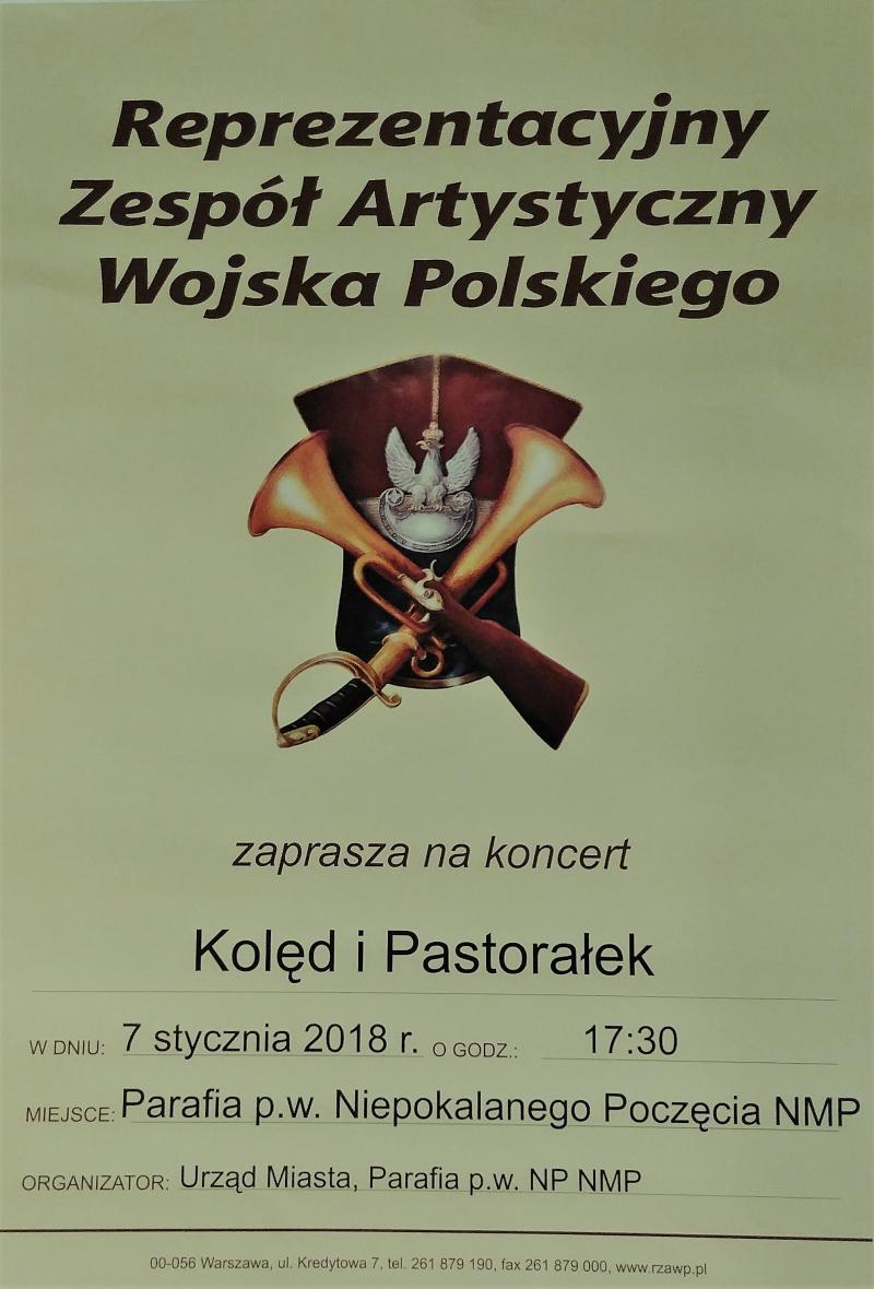 W dniu 7 stycznia 2018 roku o godz. 17:30 w kościele p.w. Niepokalanie Poczętej NMP w Rawie Mazowieckiej wystąpi Reprezentacyjny Zespół Artystyczny Wojska Polskiego z koncertem najpiękniejszych polskich kolęd i pastorałek.